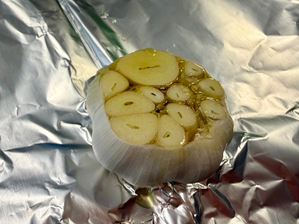 - Preheat oven to 425°F. Cut 1/2 inch off top of garlic bulb to expose ends of cloves. Leaving bulb whole, remove any loose, papery outer layers. Place bulb, cut side up, in a small ramekin or custard cup. Lightly drizzle with olive oil and sprinkle with salt. Cover ramekin with foil. Roast 25 to 35 minutes. Once cool enough to handle, squeeze bottom of roasted bulb to release garlic cloves onto a cutting board; lightly sprinkle with additional salt. Use the side of a chef’s knife to mash the garlic into a paste. (Garlic paste can be made ahead and chilled up to 3 days.)