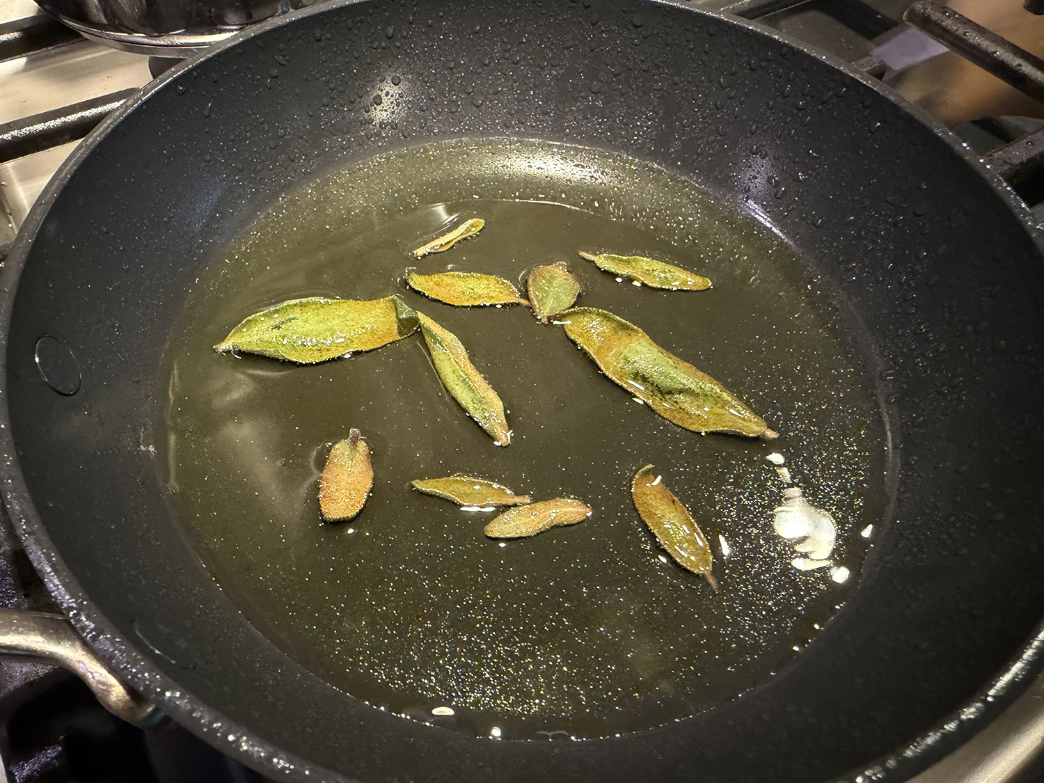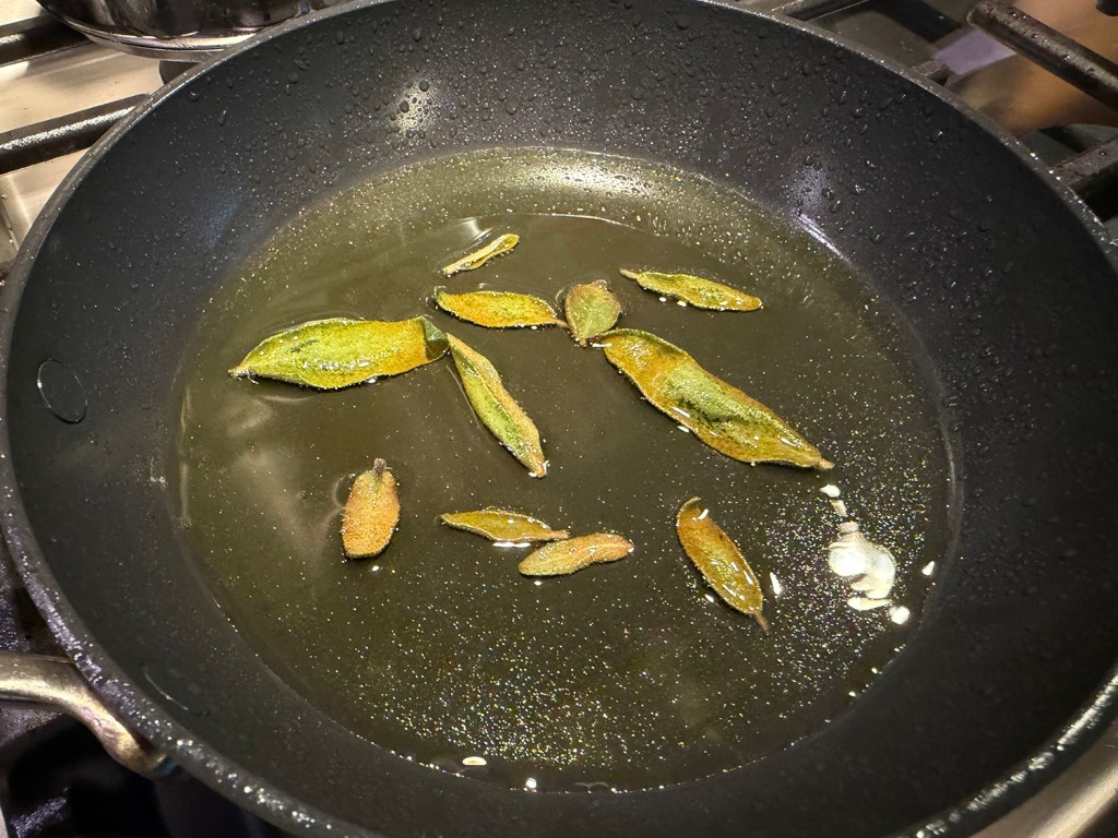 Pour enough vegetable oil into a small saucepan to cover bottom of the pan; heat over medium. Add fresh dry sage leaves, a few at a time. Cook until lightly browned and starting to crisp, 2 minutes. Remove to side dish until ready to adorn the potatoes.