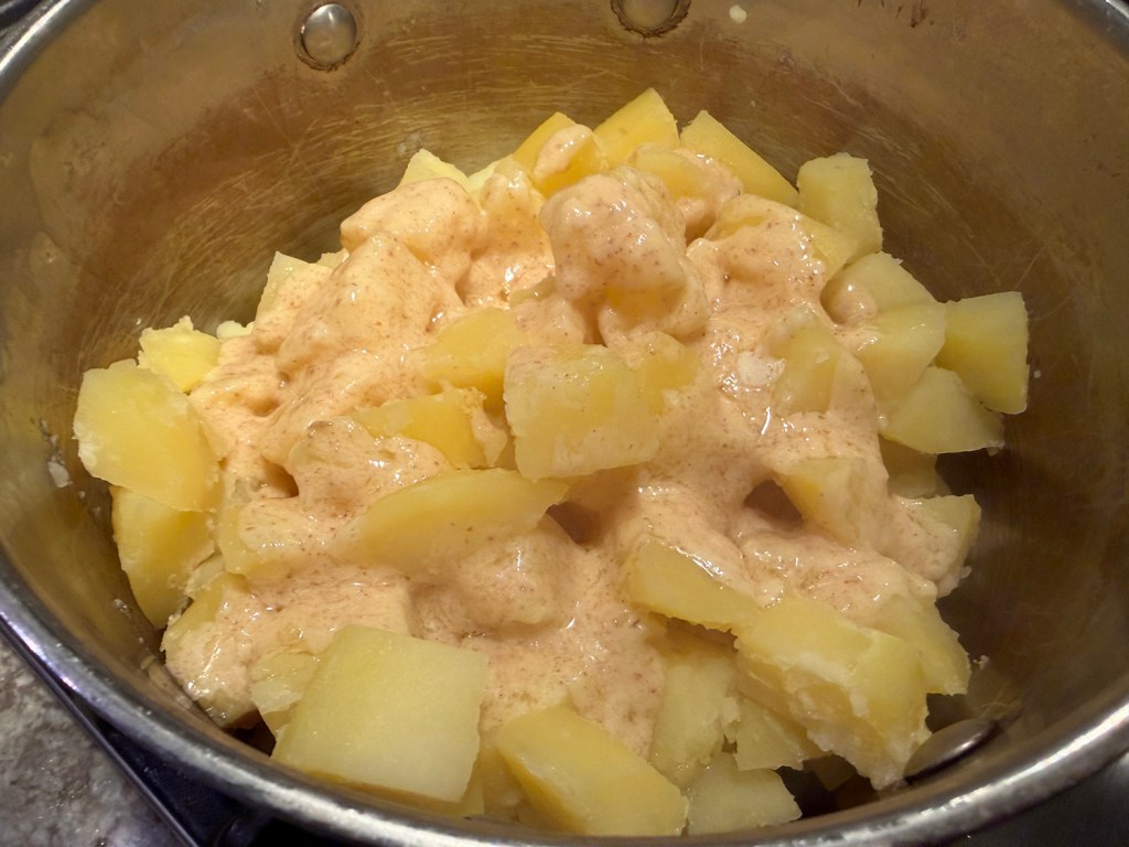 - Meanwhile, in a 4- to 6-qt. pot cook potatoes, covered, in enough lightly salted boiling water to cover until tender, 20 to 25 minutes; drain. Return hot potatoes to hot pot.