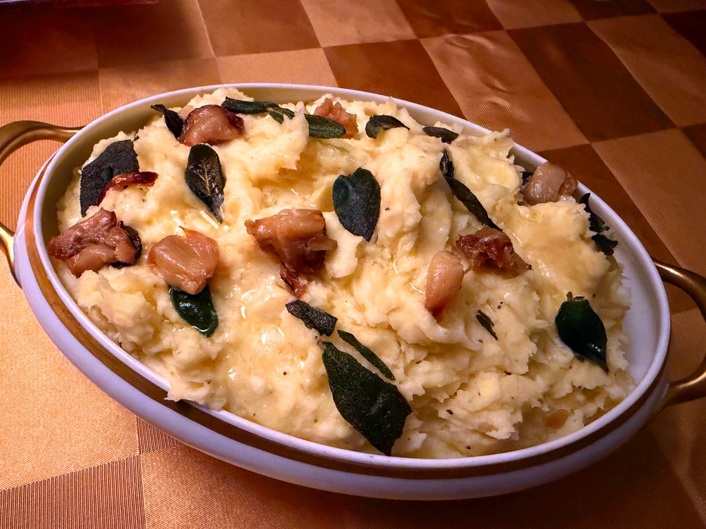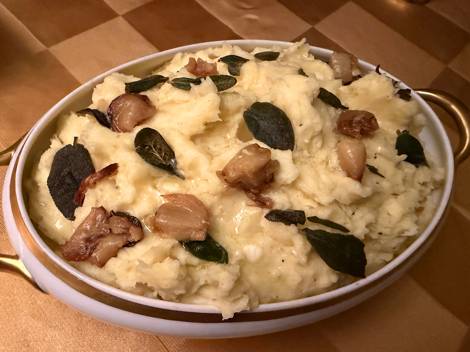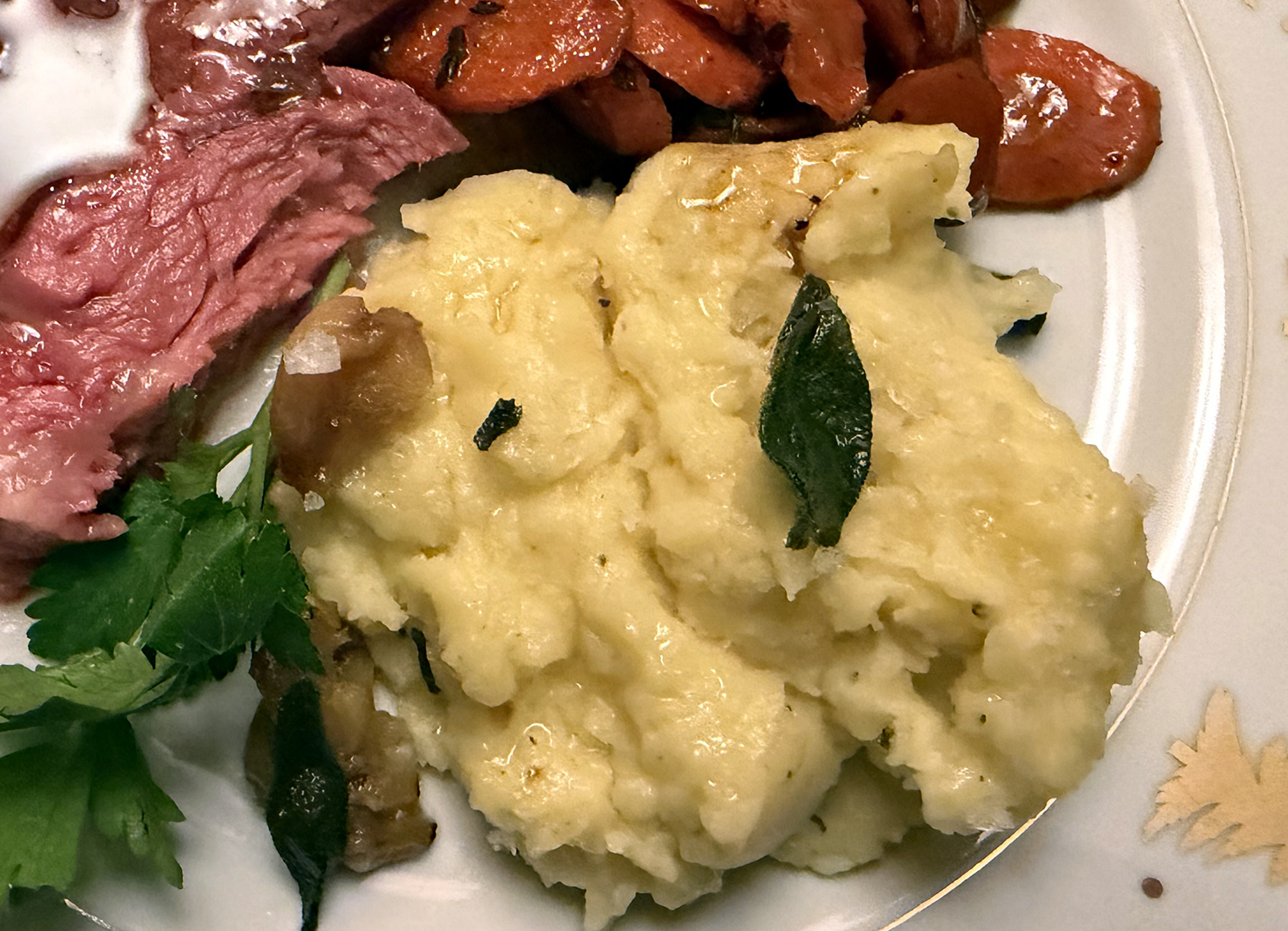 Even though the fried sage leaves are optional, they add not only visual impact, but a nice herby texture. Additionally, we used roasted garlic paste in the potato mixture, and topped them with roasted garlic cloves along with the crisped sage leaves and cracked black pepper. A perfect accompaniment to our Reverse-Sear Prime Rib.