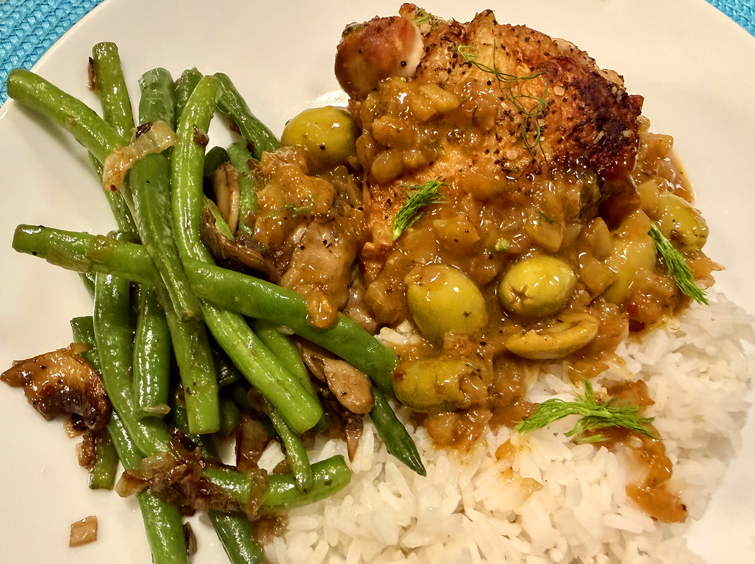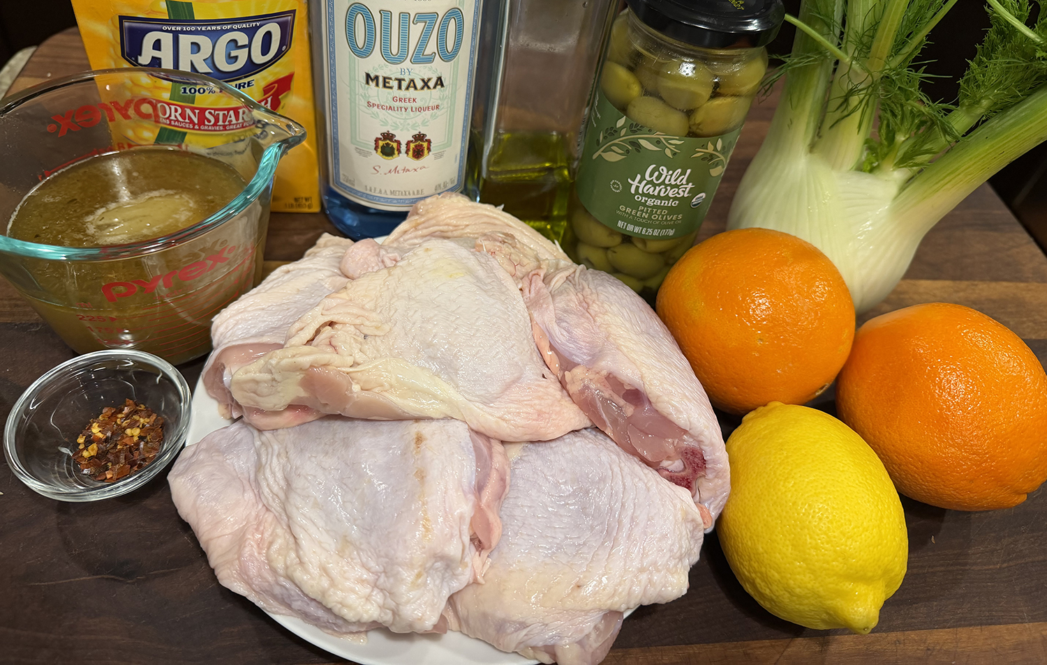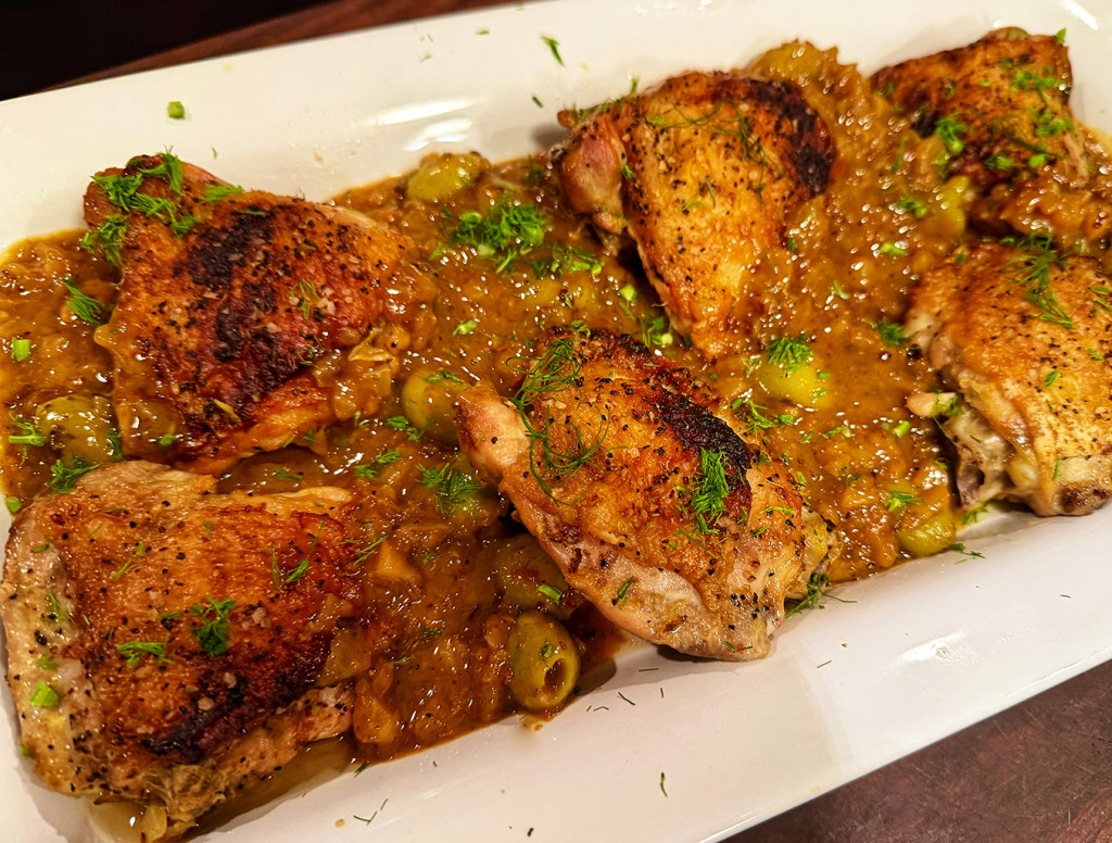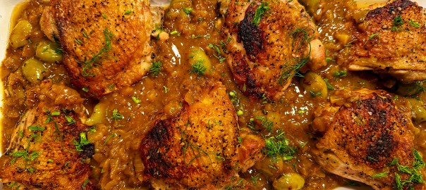 Braised Chicken Thighs with Fennel, Orange and Cracked Olives