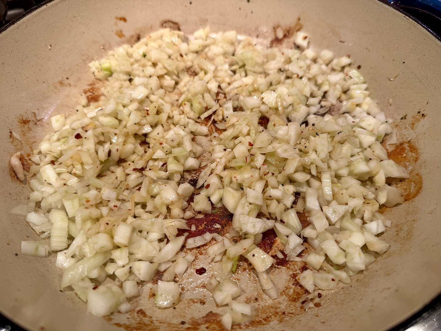 - Pour off all but 2 tablespoons fat from skillet. Add chopped fennel and red pepper flakes and cook, stirring frequently, until fennel is lightly browned, 4 to 5 minutes. Add broth, orange juice, and Pernod; bring to simmer, scraping up any browned bits. Return chicken to skillet, skin side up (skin will be above surface of liquid). Transfer skillet to oven and bake, uncovered, until chicken registers 195 degrees, 35 to 40 minutes. Whisk water and cornstarch together in small bowl; set aside.