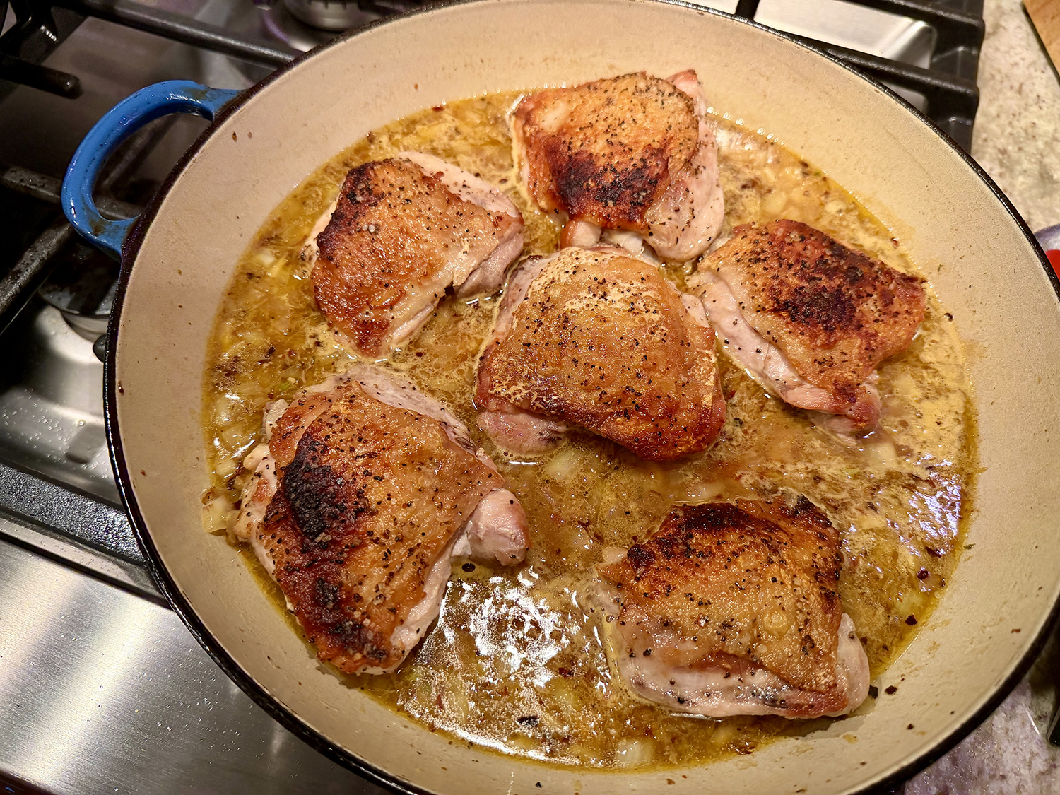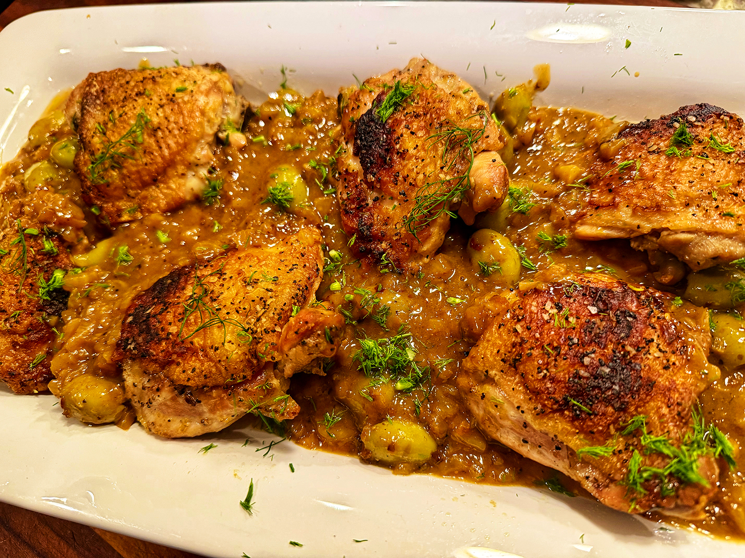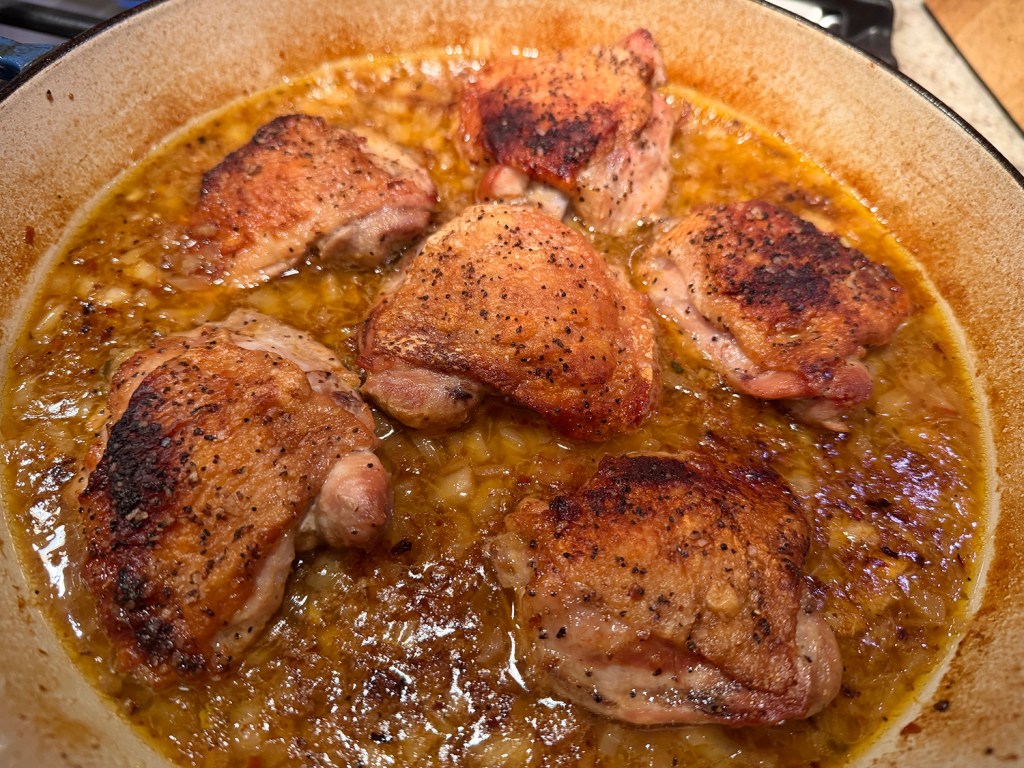 Awesome sauce—literally!! Of course using your own homemade chicken stock amps up the depth of flavor tremendously, and The Hubs had recently made a double batch. This stove-to-oven method produces well-rendered skin, meltingly-tender meat, and a savory ready-made sauce.