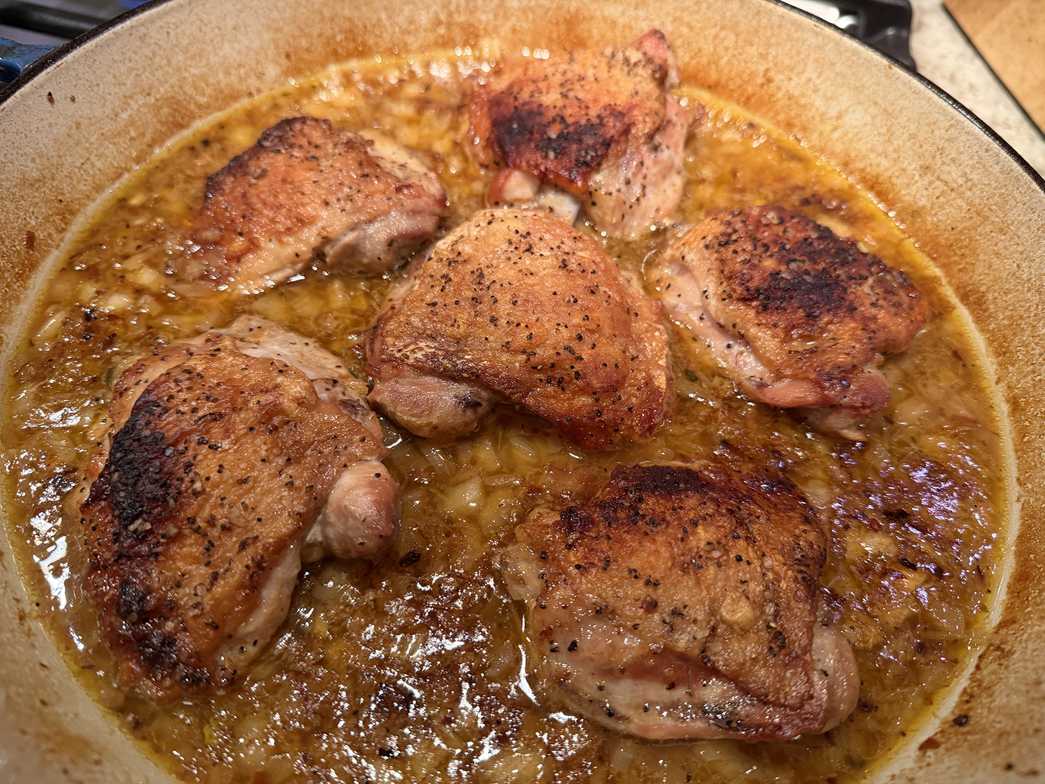 The braise is started by searing bone-in, skin-on thighs to crisp the skin. The thighs are then transferred to the oven where they simmer, skin side up, in a flavorful mix of chicken broth, orange juice, fennel, and Pernod until they reached 195 degrees and turned tender and juicy.