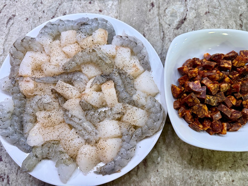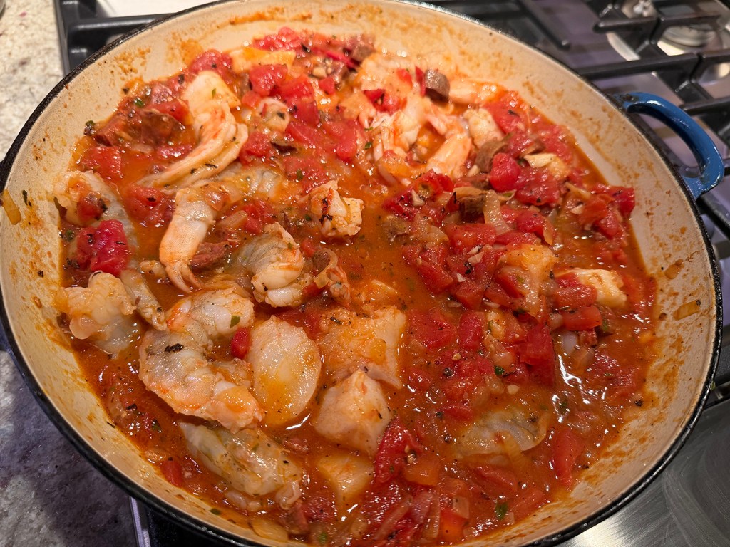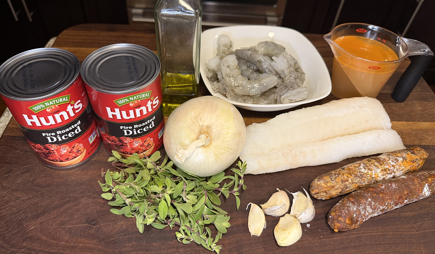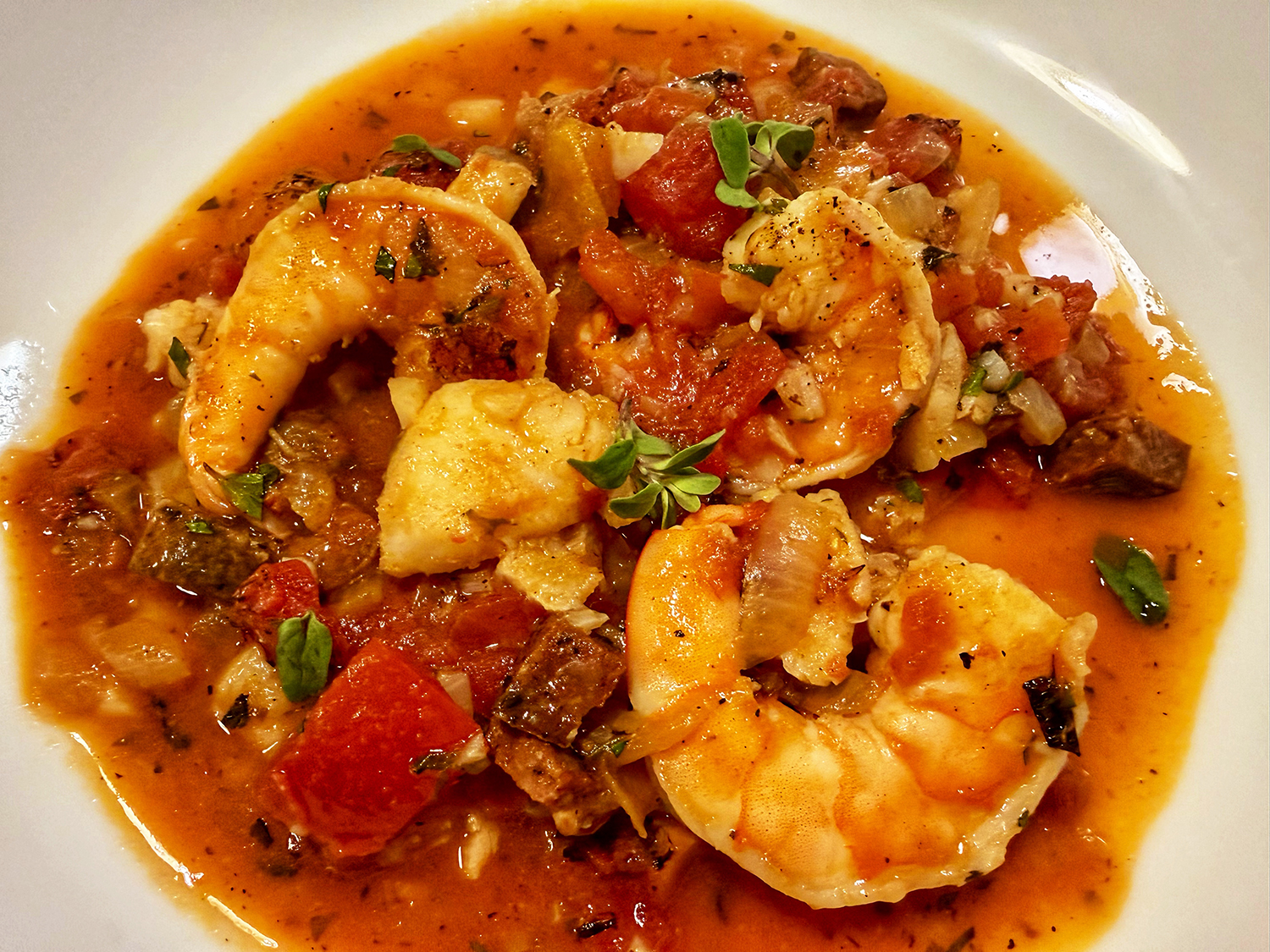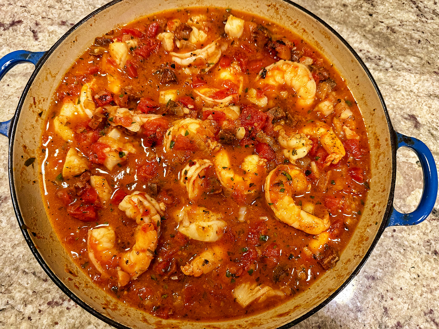 This stew is started by cooking Spanish-style chorizo and onion together to infuse a bold flavor combination into its base. A mix of shrimp and cod are added at the end of the process to ensure that they are not overcooked.