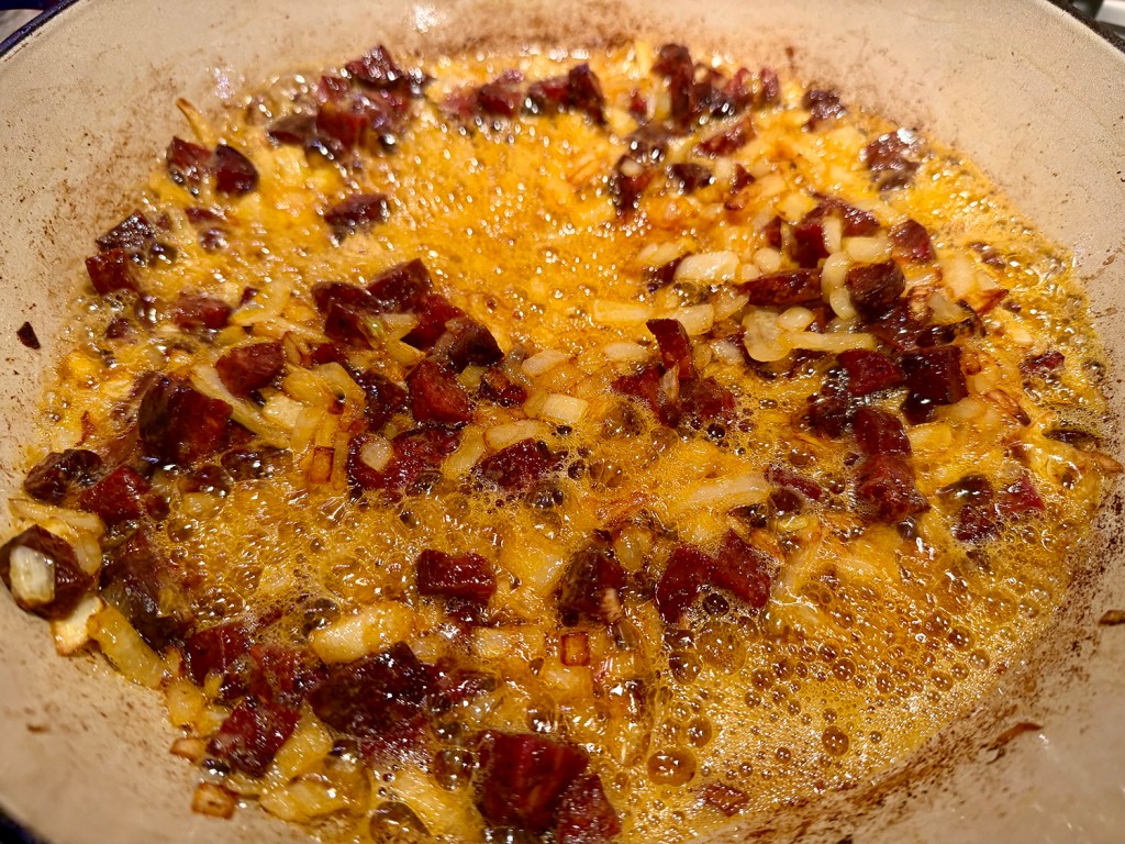 - Heat oil in large saucepan over medium-high heat until shimmering. Add chorizo and onion and cook until both are lightly browned, 7 to 9 minutes.