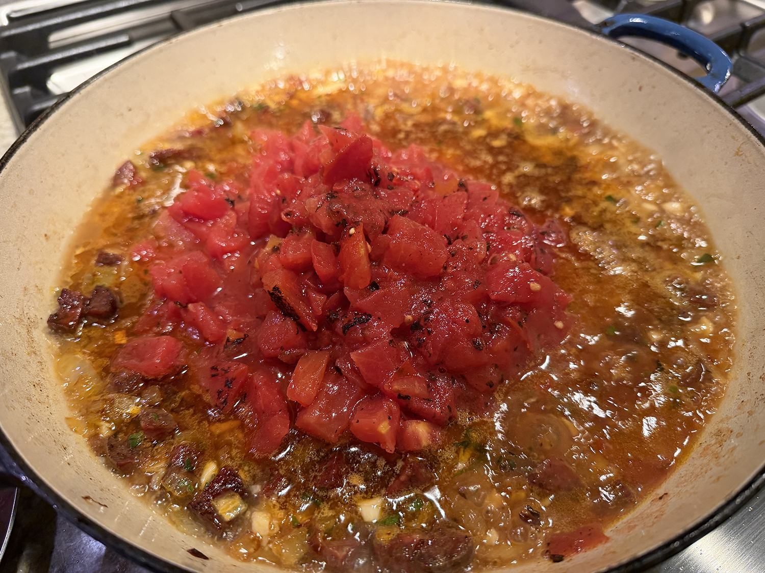 The Hubs had made homemade seafood stock earlier in the day, so in place of the bottle of clam juice, we incorporated the stock—which adds tons of flavor. Another flavor-amping choice was using fire-roasted diced tomatoes.