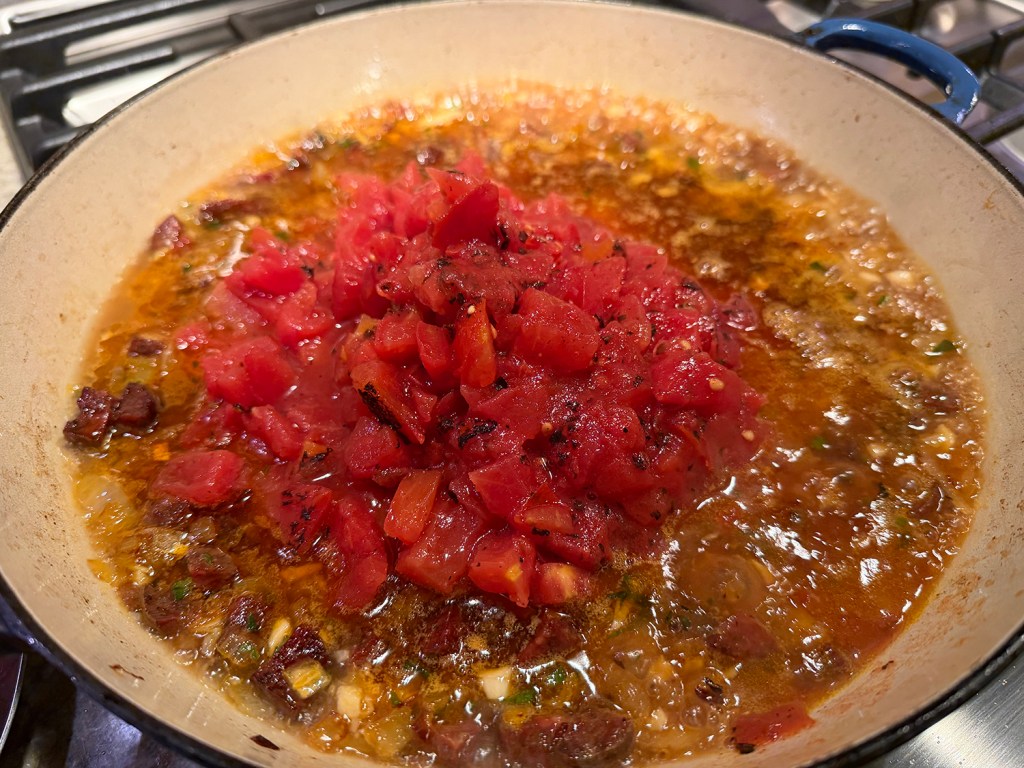 - Stir in garlic and 1 teaspoon oregano and cook until fragrant, about 30 seconds. Add tomatoes and their juice and clam juice, scraping up any browned bits, and bring to simmer. Cook until slightly thickened, about 10 minutes.