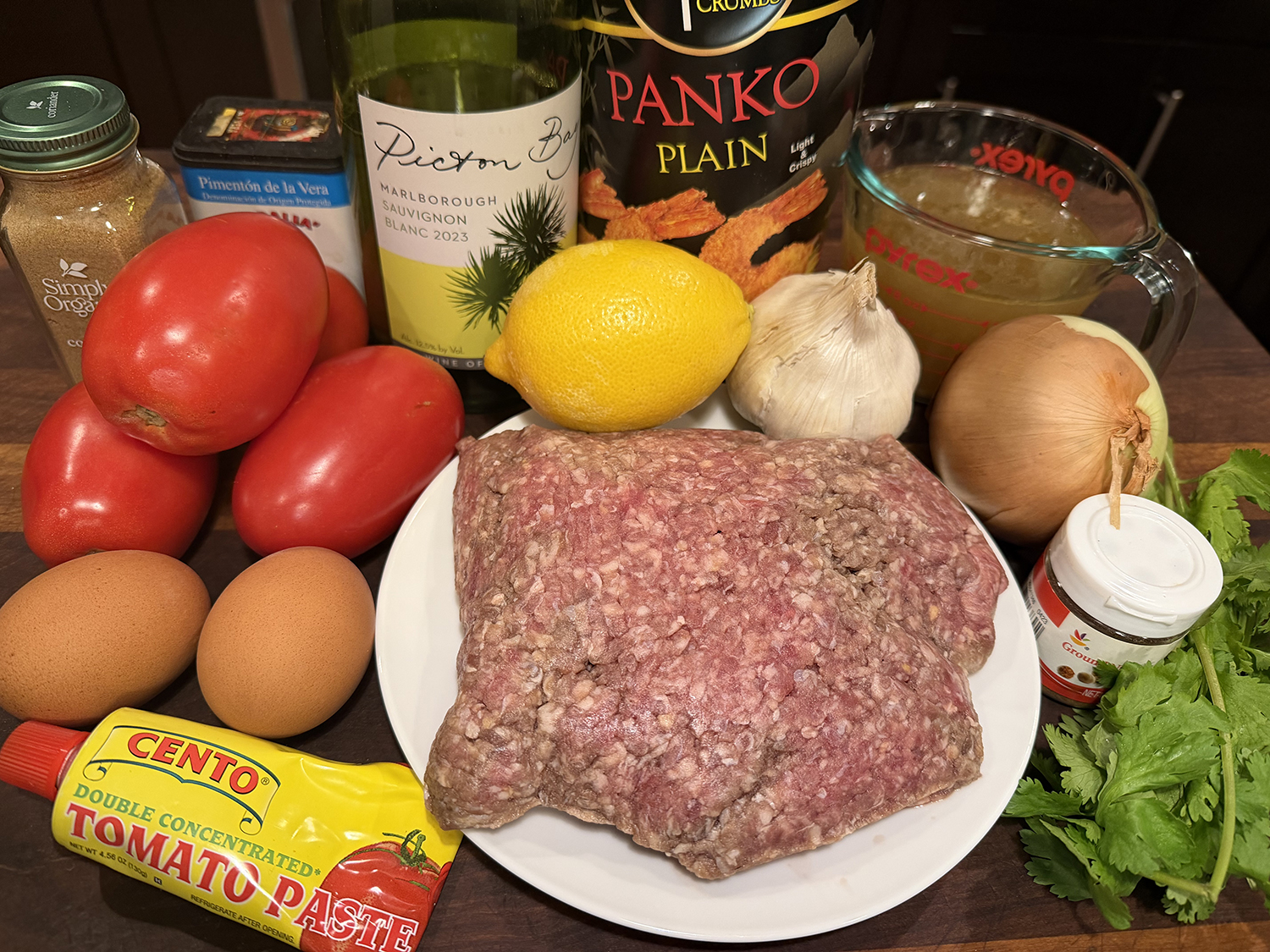 - Whisk eggs in a large bowl until smooth. Add beef, panko, coriander, lemon zest, black pepper, nutmeg, 2 teaspoons garlic, and 1 1/2 teaspoons salt; gently mix using your hands, taking care to avoid overmixing. Form mixture into 6 (5-ounce) balls (about 2/3 cup each); space evenly on prepared baking sheet. Bake until golden brown, 22 to 25 minutes. (Meatballs will not be fully cooked through.)