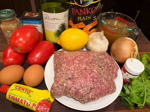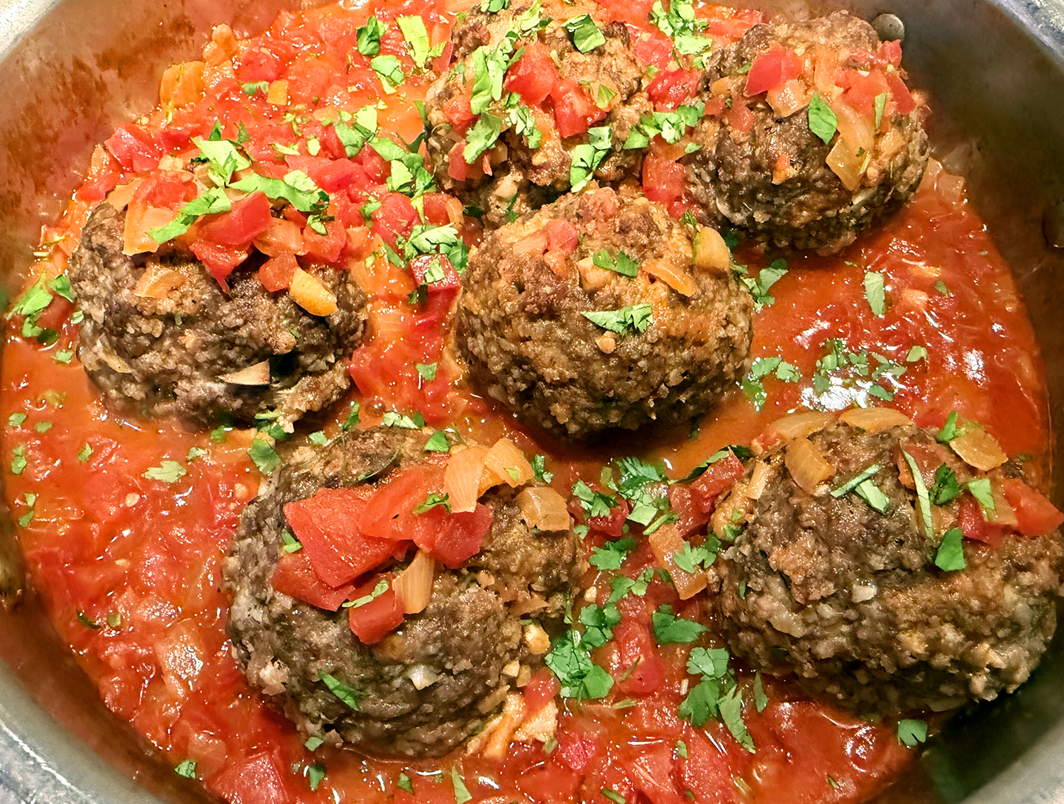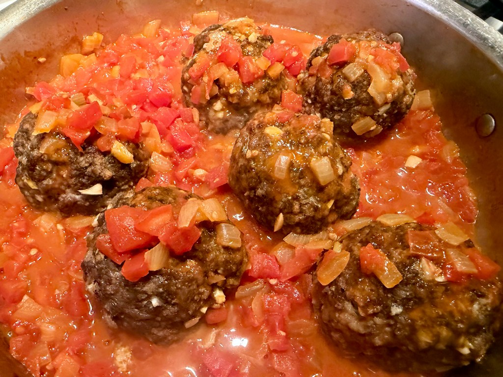 There was a spread in a recent Food & Wine Magazine issue with a recipe for these oven-browned, JUMBO beef meatballs. Deeply browned oversize meatballs (see note below for size reduction) “settle into a glossy pool of tomato sauce for a dish that’s simple and quick enough for the family and elegant enough for a small gathering.”