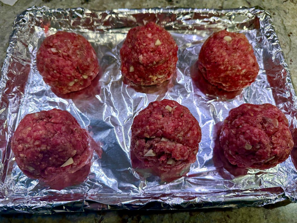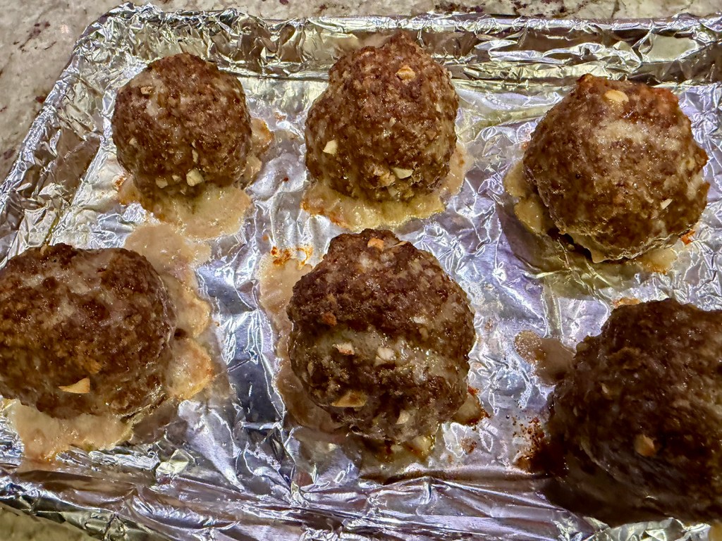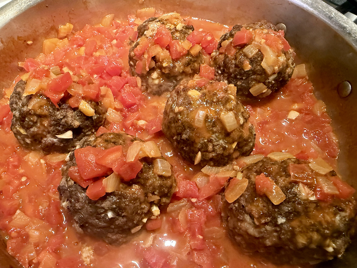 NOTE: These meatballs are wonderfully supersized, but if you’d rather make smaller ones, they’ll still be just as delicious. For each meatball, use about two tablespoons of the meat mixture, and roll gently to shape. Arrange the meatballs on an aluminum foil–lined baking sheet, and bake at 425°F until just browned, 8 to 10 minutes. Broil for just a couple of minutes until deep golden brown before simmering in the sauce until a thermometer inserted into the center of a meatball registers 165°F.