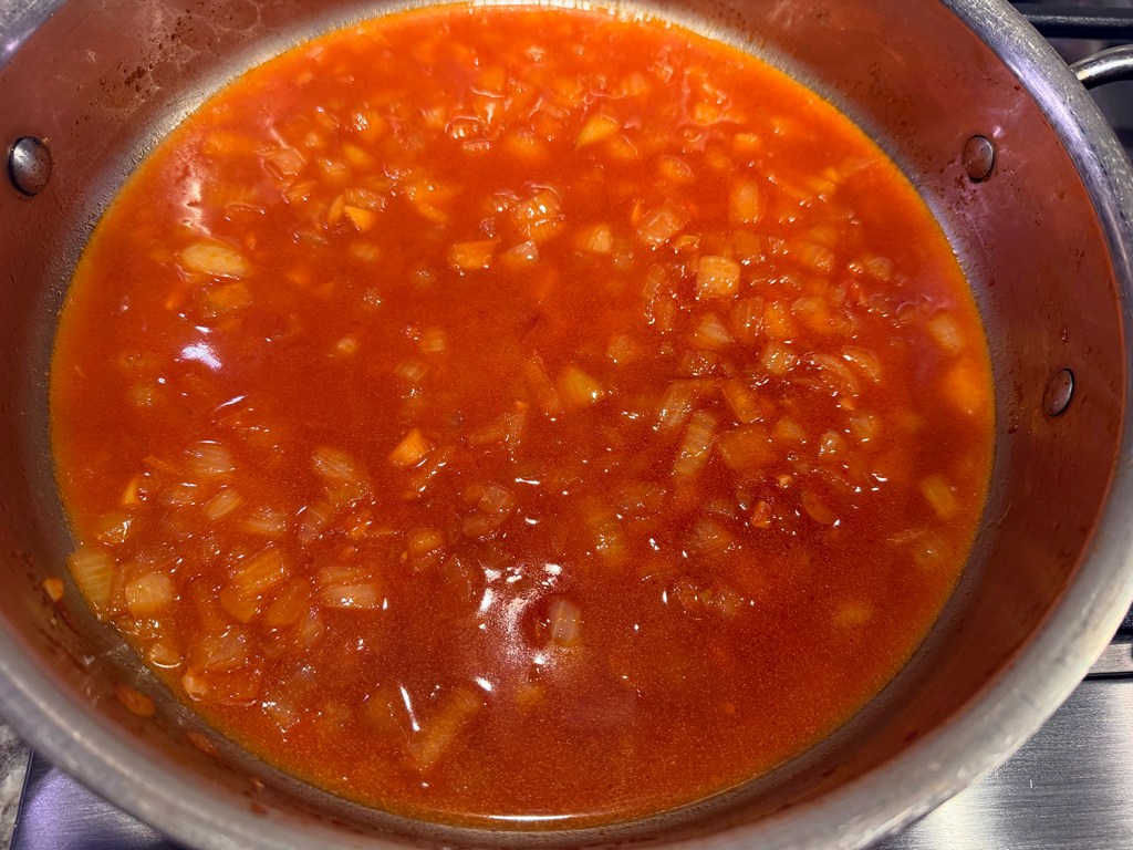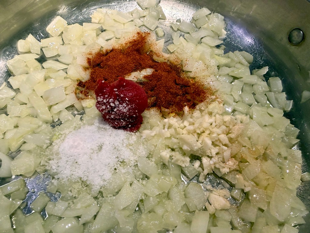 - Meanwhile, heat oil in a large, deep skillet over medium. Add onion; cook, stirring occasionally, until starting to soften, 4 to 5 minutes. Stir in tomato paste, paprika, remaining 1 teaspoon garlic, and remaining 1 teaspoon salt; cook, stirring constantly, until mixture is deep red, about 2 minutes.