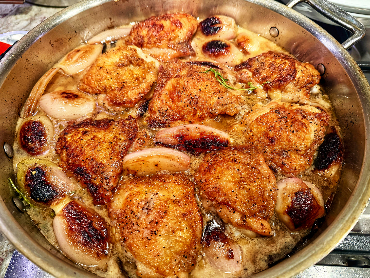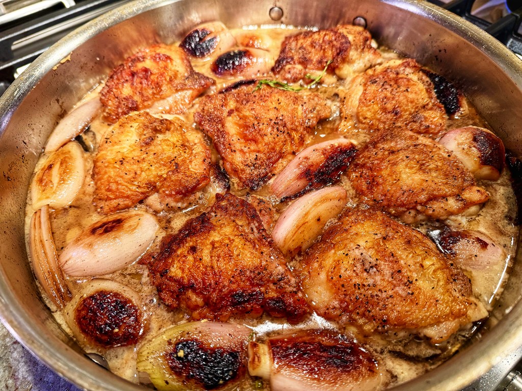Anyway, it is worth the time because we loved the crispy skin, jammy shallots and delicious sauce. Speaking of shallots, unless you have small ones, do yourself a favor and cut them in half lengthwise, otherwise the chicken thighs are done before the shallots are soft enough.
