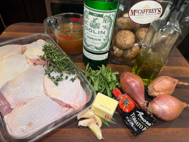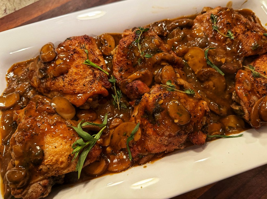Très bon! Chicken Chasseur, literally “hunter’s chicken” in French, harks back to a time when game birds and mushrooms from the woods were a natural autumn combination. Though Italian chicken cacciatore also has the same translation, the ingredients are quite different — most notably, it often includes bell pepper, uses red instead of white wine, and relies on a different set of herbs for flavor.