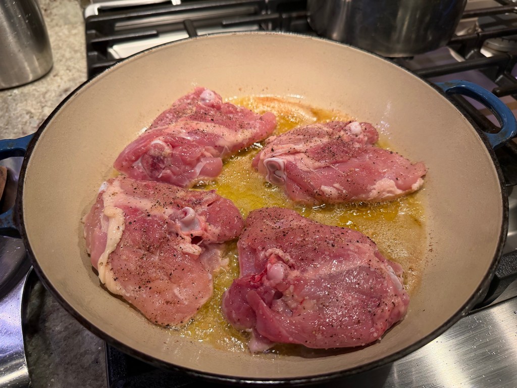 We were in a bit of a time crunch, so we cranked the oven to 325°F and cooked the covered dish for 40 minutes (changes noted in the directions below). To ensure that the chicken thighs brown instead of steam, it’s best to do so in two batches, leaving space between each piece.