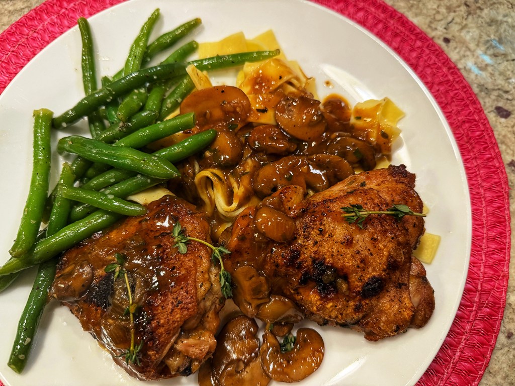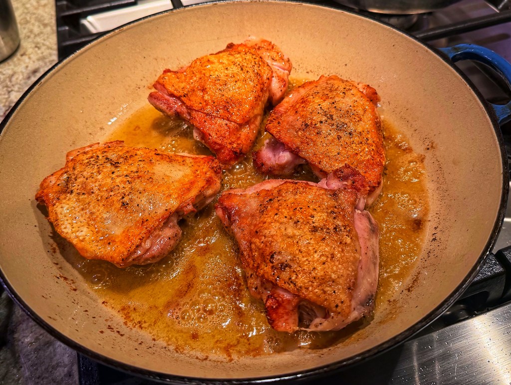 Let me just say, we could not believe how incredibly delicious this meal was. The depth of flavor was mind-boggling! A couple of things we did differently was broil the thighs at the very end for about 3 minutes to crisp up the skin, and add a cornstarch slurry to thicken the sauce while the chicken was under the broiler.