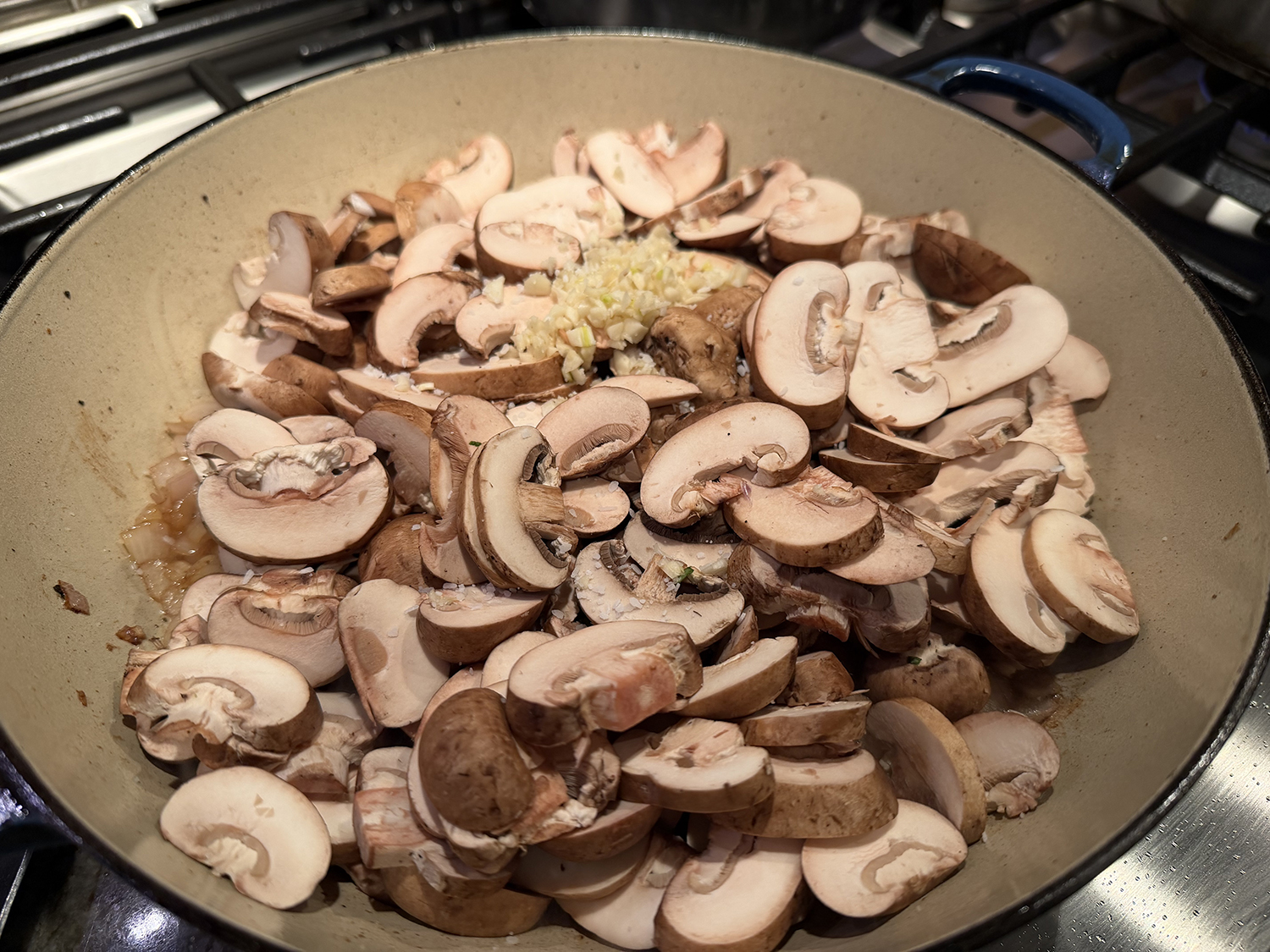 - Add 1 tablespoon butter to the pan and reduce heat to medium-low. Add onion and cook, stirring occasionally, until translucent, about 5 minutes. Increase the heat to medium-high. Add the mushrooms, garlic, and 1/4 teaspoon salt. Cook, stirring frequently, until the vegetables are browned, about 5 minutes.