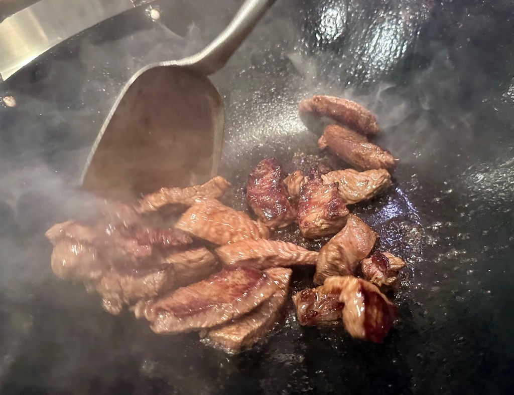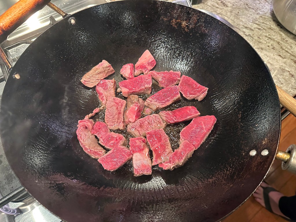 2. Heat empty 14-inch flat-bottom wok over high heat until just beginning to smoke. Drizzle 1½ teaspoons vegetable oil around perimeter of wok and heat until smoking. Add half of beef and use tongs to break up any meat that clumps. Cook, without stirring, until beef is browned on bottom, about 1 minute, then stir and cook until beef is browned around edges, about 1 minute longer. Transfer beef to medium bowl. Wipe wok clean and repeat with 1½ teaspoons oil and remaining beef.
