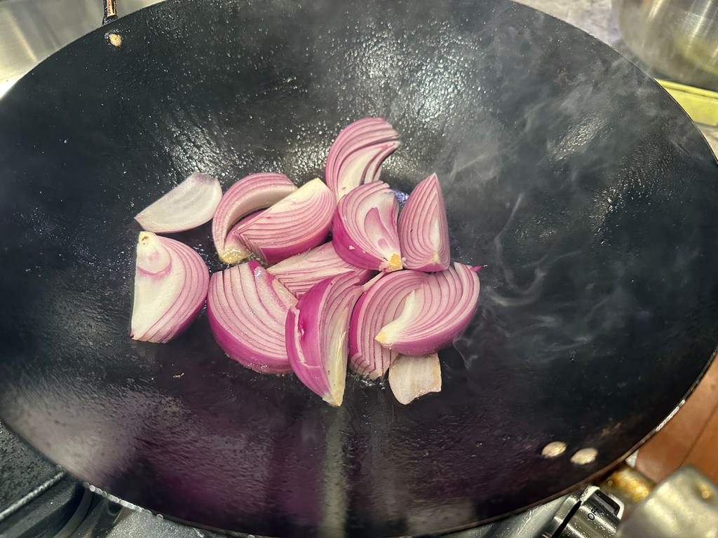 3. Wipe wok clean, then add remaining 1 teaspoon oil; heat over high heat until just beginning to smoke. Add 1 small red onion, halved and sliced through root end into ¾-inch‑thick pieces, and cook, stirring occasionally, until beginning to brown, about 1 minute. Add 2 minced garlic cloves and cook until fragrant, about 30 seconds. Transfer to bowl with beef.