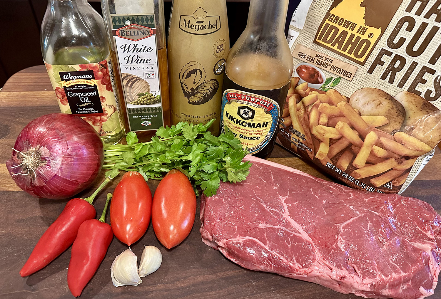 Fresh aji amarillo chiles can be challenging to find; look for frozen chiles in some Peruvian, Hispanic, or possibly Asian grocery stores. If unavailable, use red fresnos, red jalapeños, or orange mini bell peppers. Beef tenderloin is preferred (and expensive!) but sirloin or skirt steak will also work. We used a sirloin steak, the least expensive of the three options, and it was perfect!