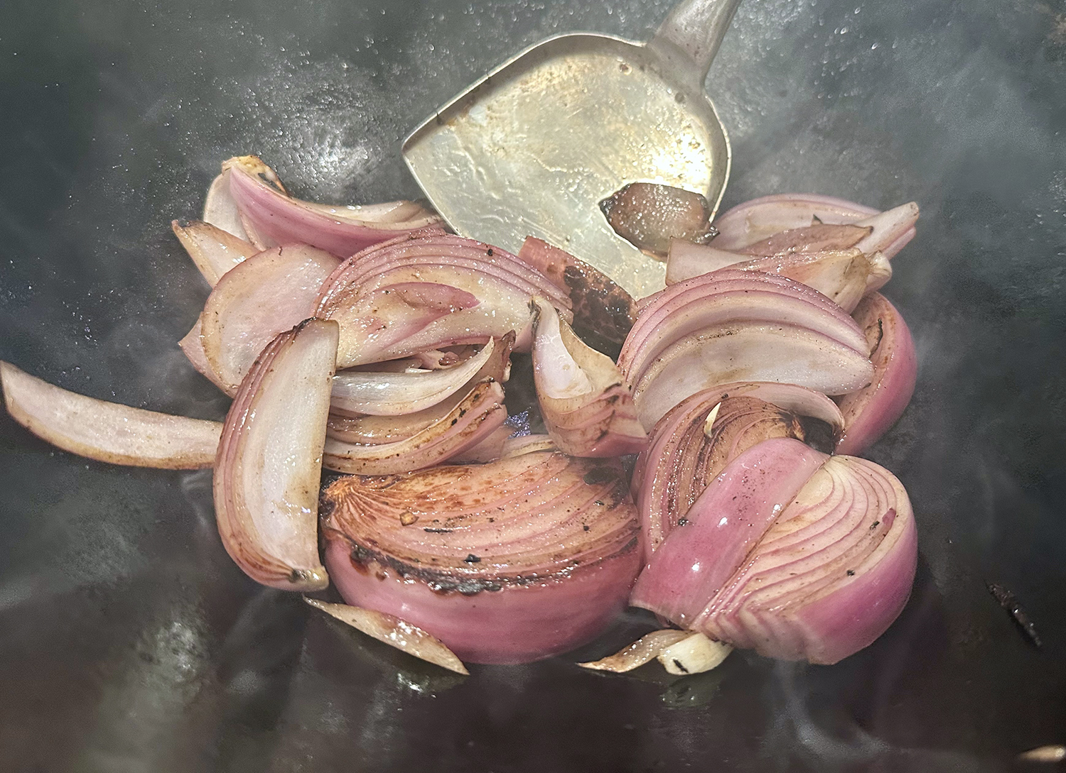 3. Wipe wok clean, then add remaining 1 teaspoon oil; heat over high heat until just beginning to smoke. Add 1 small red onion, halved and sliced through root end into ¾-inch‑thick pieces, and cook, stirring occasionally, until beginning to brown, about 1 minute. Add 2 minced garlic cloves and cook until fragrant, about 30 seconds. Transfer to bowl with beef.