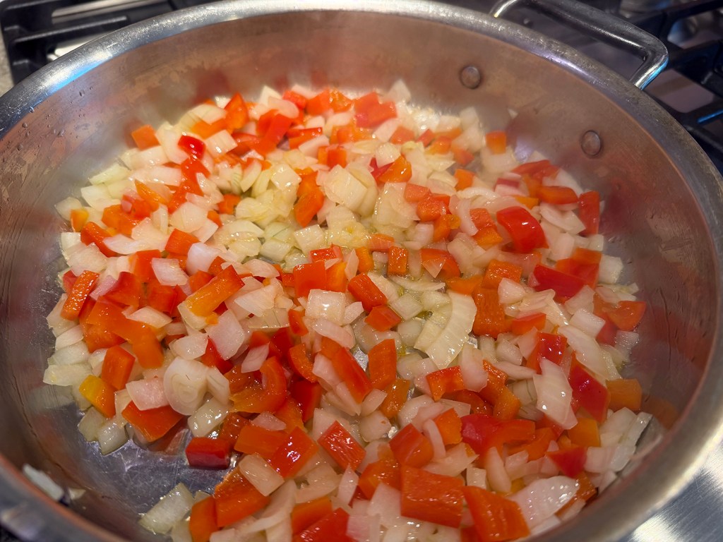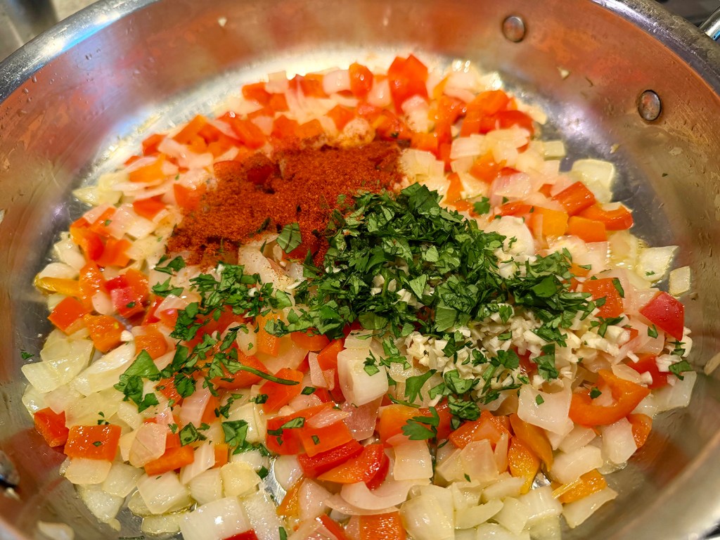 The base begins with a generous slick of oil in a wide skillet over medium-high heat. Sautéed onion and red bell pepper soften into sweetness while sliced garlic blooms into the pan, releasing its perfume before the diced tomatoes go in, they collapse into a jammy, brick-red foundation. A bit of cayenne goes in early so its heat has time to mellow and weave through everything.