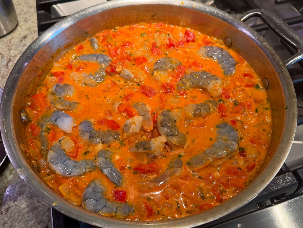 - Stir in the shrimp, reduce the heat to medium and simmer, stirring occasionally, until the shrimp are cooked through, opaque and pink, 3 to 5 minutes.