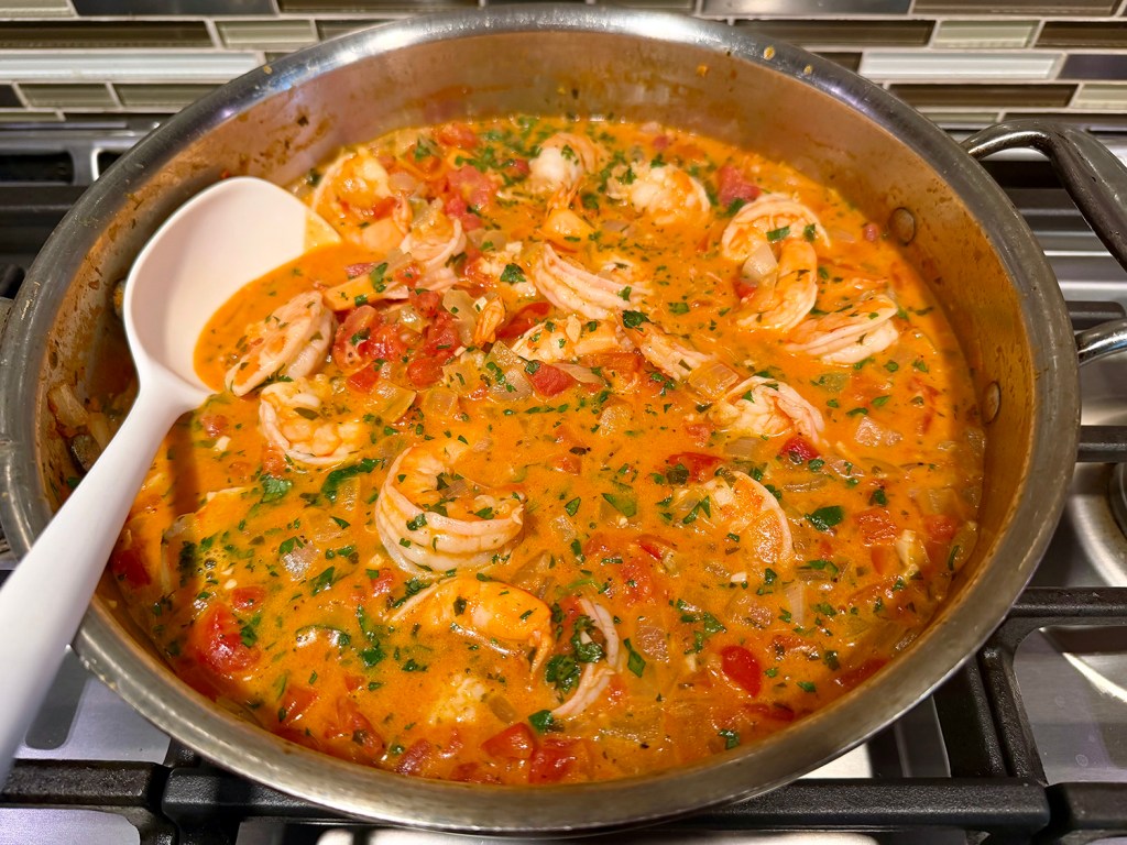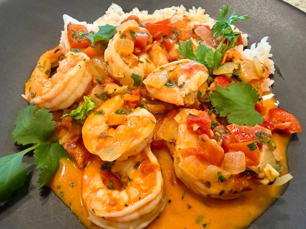 Ladle it into wide, shallow bowls over steamed white rice, which soaks up the coral sauce greedily. The first spoonful delivers everything at once: the briny sweetness of the shrimp, the lush coconut body, the tart lime cutting through, the slow warmth of cayenne building at the back of the throat, and the clean, herbal finish of cilantro.