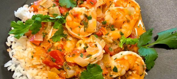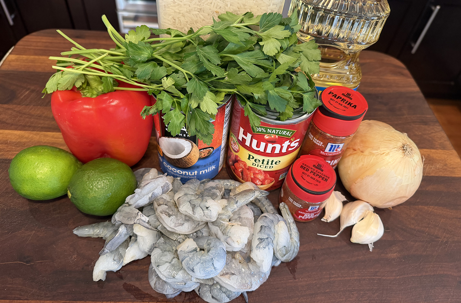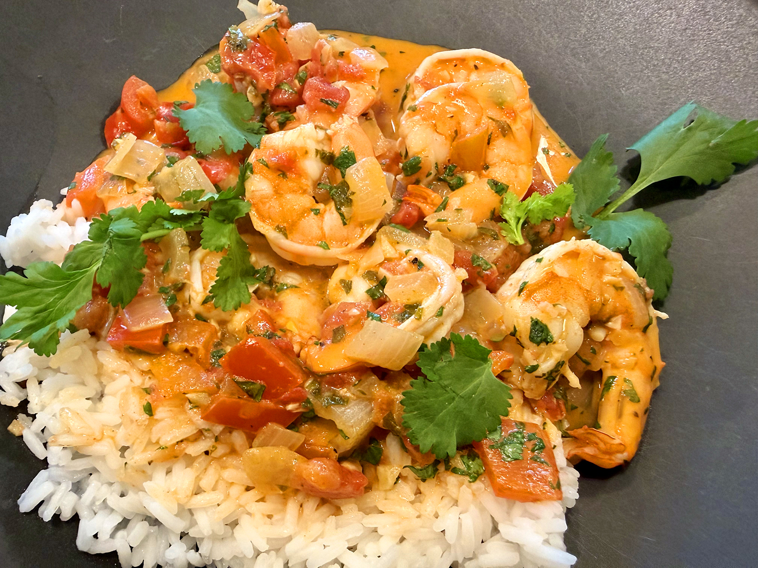 Ladle it into wide, shallow bowls over steamed white rice, which soaks up the coral sauce greedily. The first spoonful delivers everything at once: the briny sweetness of the shrimp, the lush coconut body, the tart lime cutting through, the slow warmth of cayenne building at the back of the throat, and the clean, herbal finish of cilantro.
