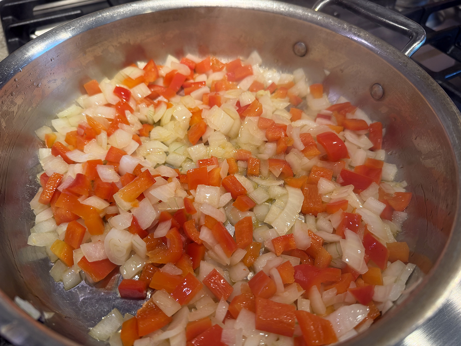 - In a large (12-inch) high-sided skillet over medium heat, heat the oil until shimmering. Add the onion and bell pepper, and cook, stirring occasionally, until softened, about 5 minutes.