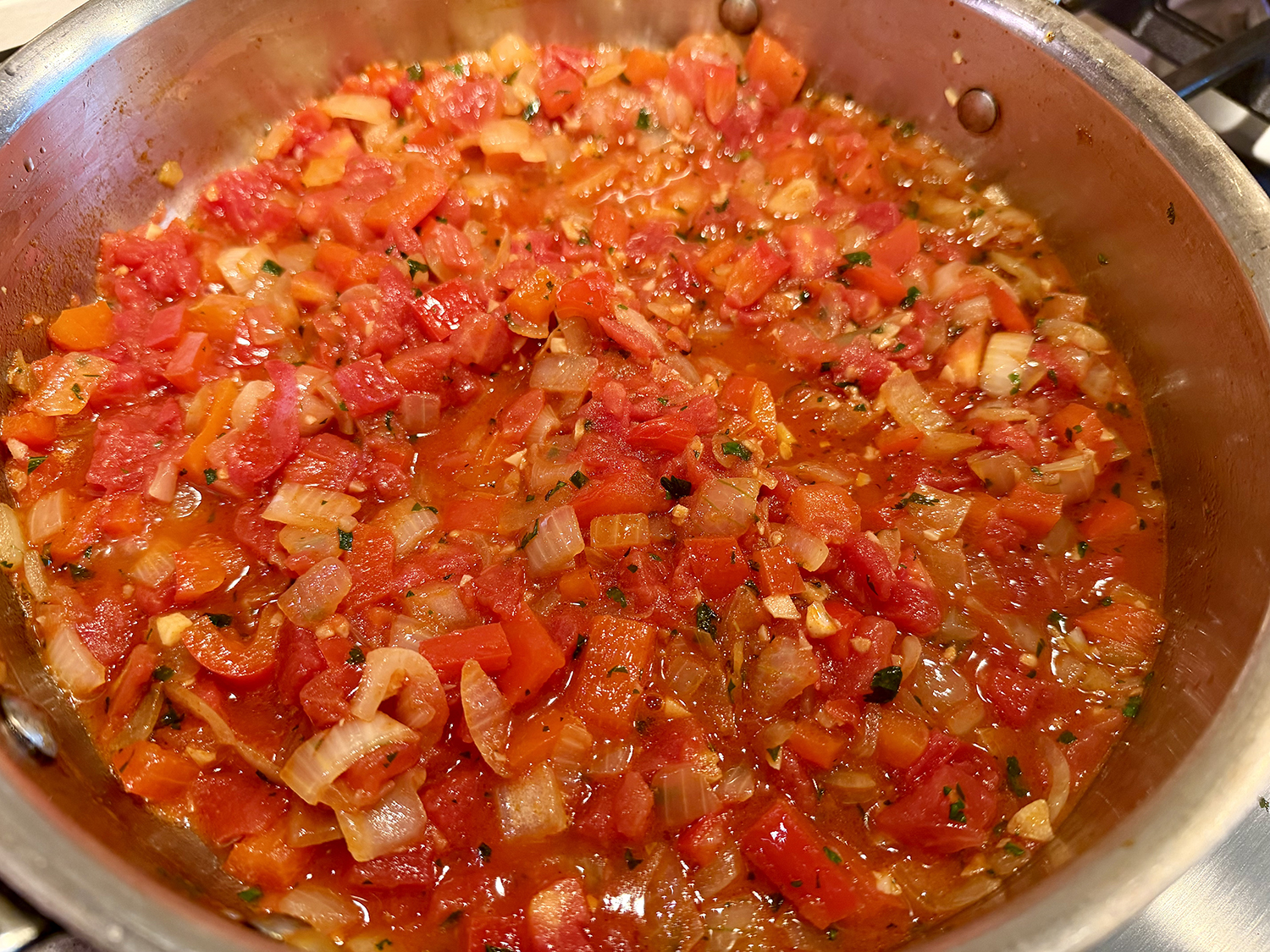 The base begins with a generous slick of oil in a wide skillet over medium-high heat. Sautéed onion and red bell pepper soften into sweetness while sliced garlic blooms into the pan, releasing its perfume before the diced tomatoes go in, they collapse into a jammy, brick-red foundation. A bit of cayenne goes in early so its heat has time to mellow and weave through everything.