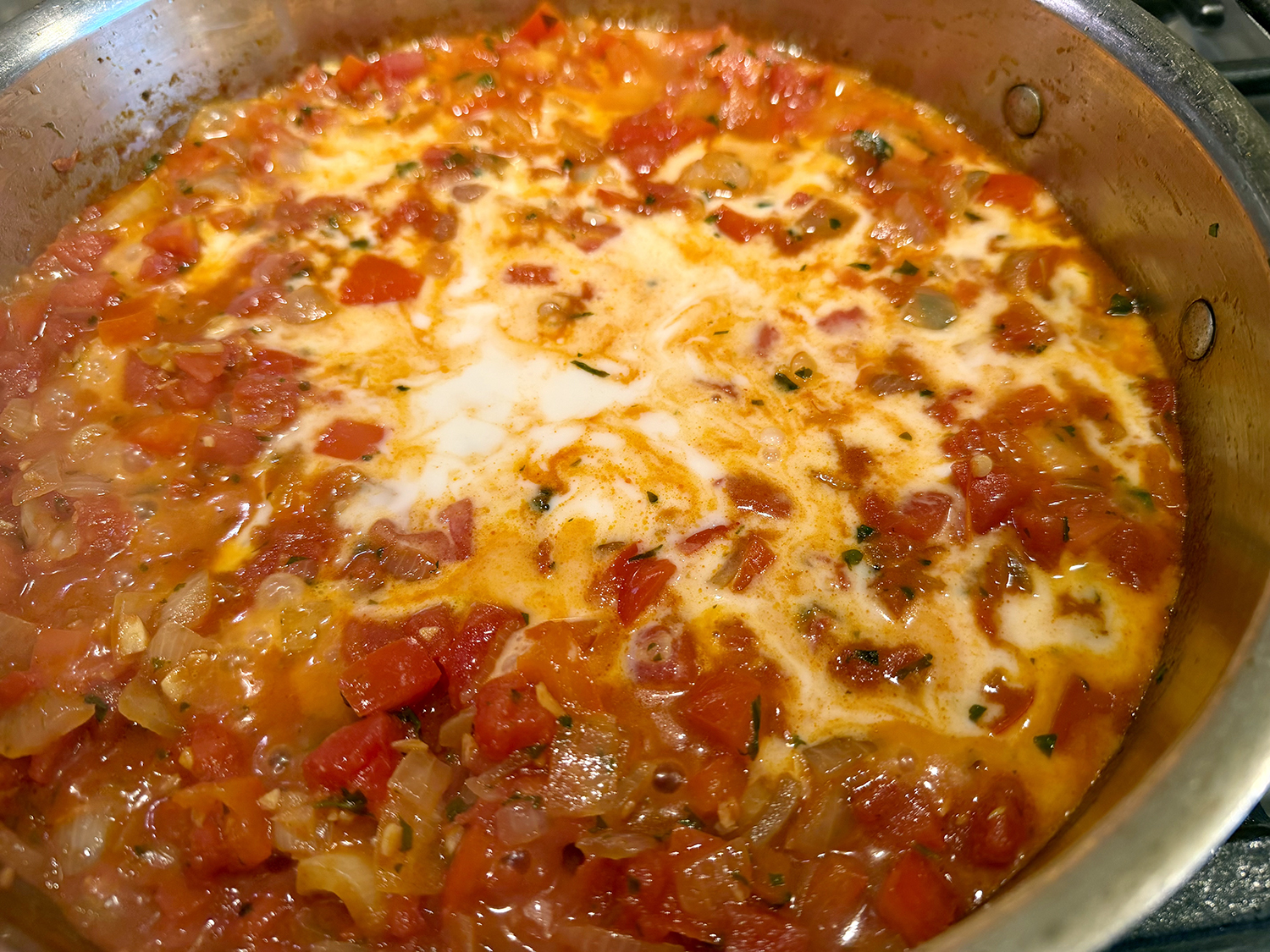 Then comes the pour of coconut milk that transforms the whole dish, cascading into the tomato base and the two swirl together into a blush-toned, velvety sauce. It simmers a few minutes until it thickens just slightly at the edges, concentrating the flavors. The aroma at this point — sweet coconut, bright acid, gentle heat — is already intoxicating.
