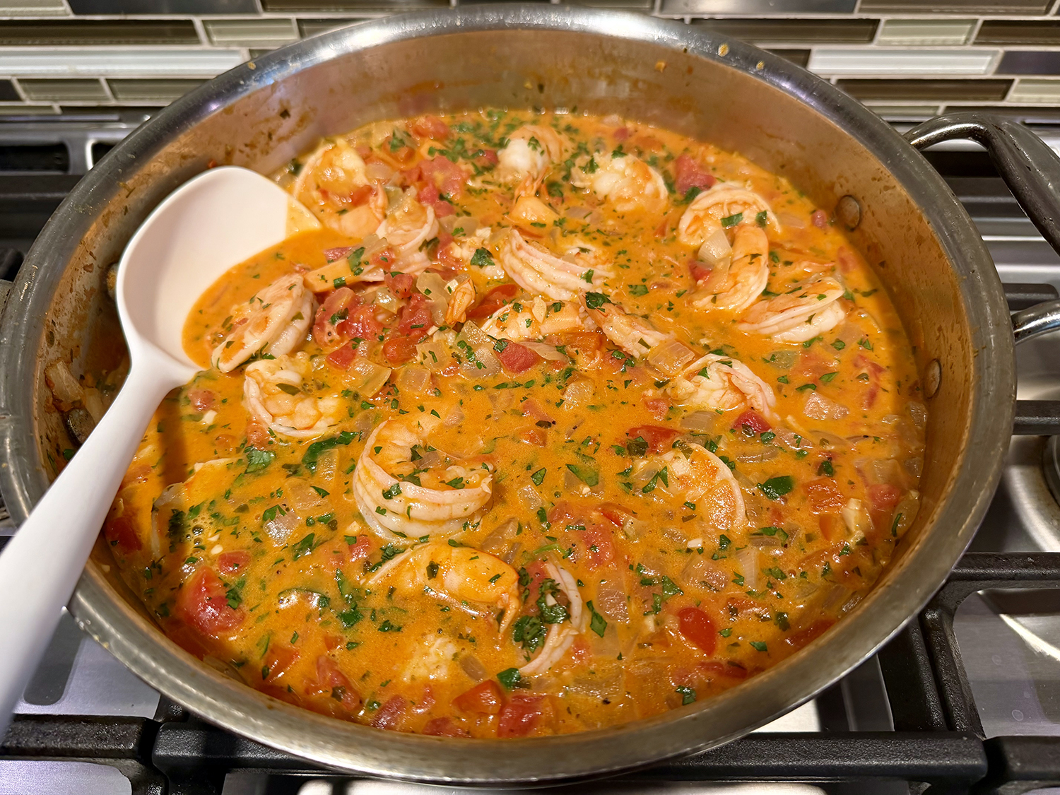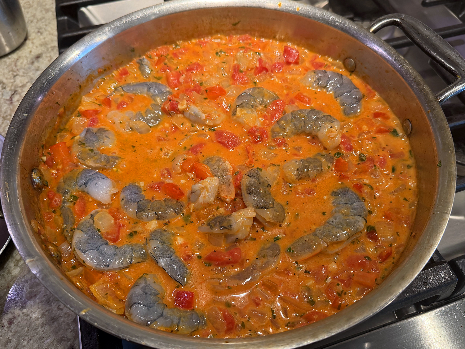 - Stir in the shrimp, reduce the heat to medium and simmer, stirring occasionally, until the shrimp are cooked through, opaque and pink, 3 to 5 minutes.