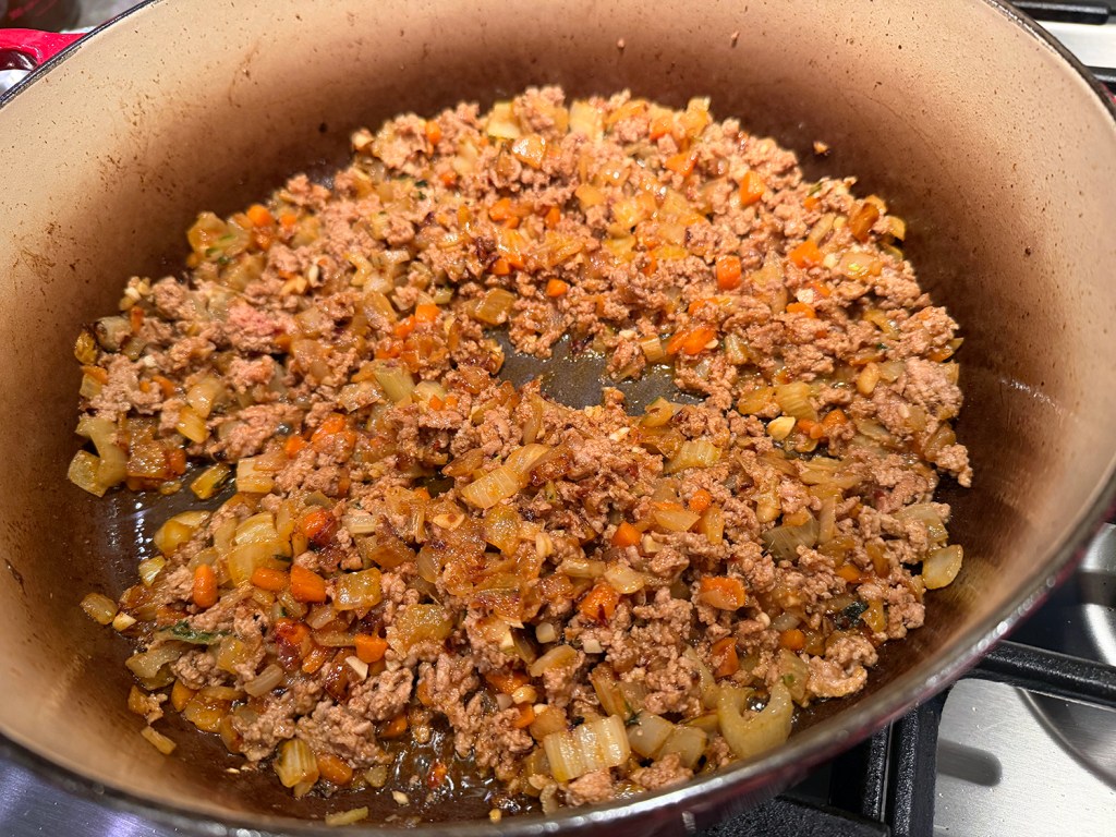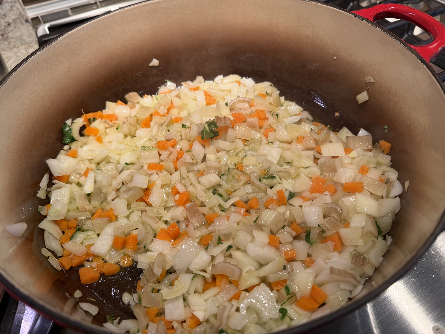 - Heat a large pot over medium-high for a minute or so to warm it up. Add the oil and heat until it thins out, about 30 seconds. Add onion and carrot, and sauté until very soft and brown at the edges, 7 to 10 minutes.