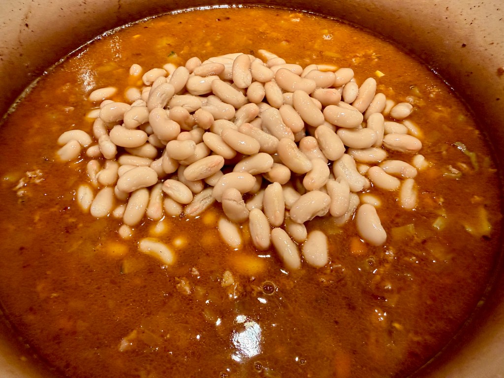 - Add stock and beans, and bring to a simmer. Let simmer until the soup is thick and flavorful, adding more salt if needed, 15 to 25 minutes. If you like a thicker broth, you can smash some of the beans with the back of the spoon to release their starch. Or leave the beans whole for a brothier soup.