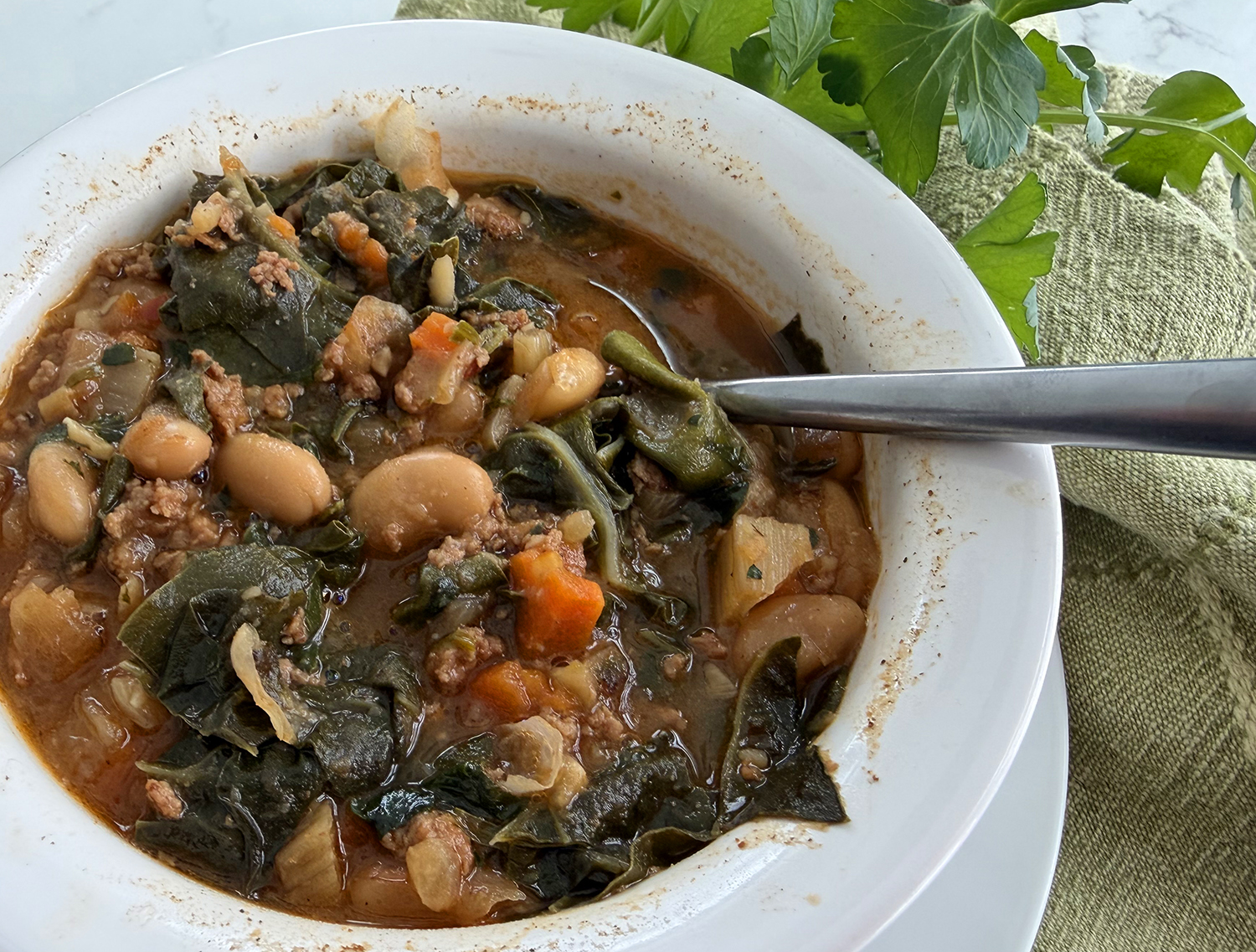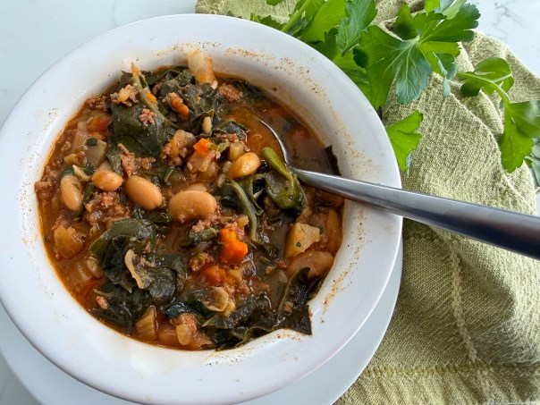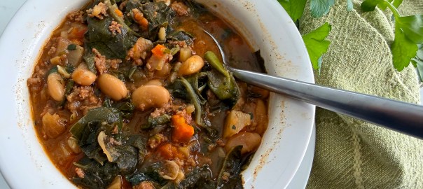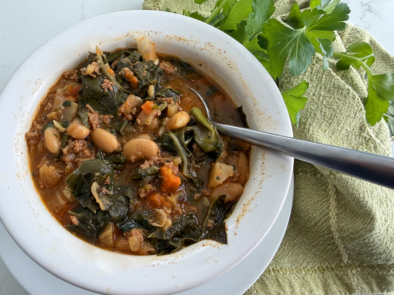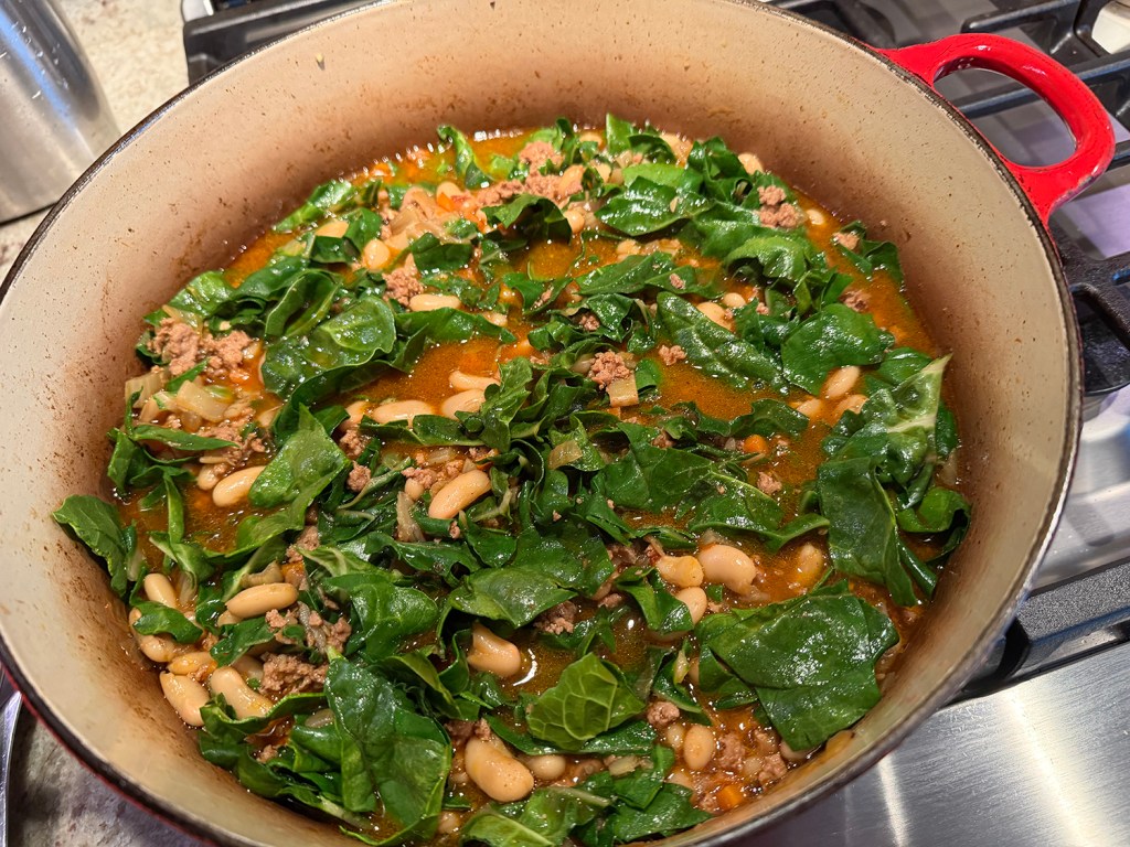 Chicken stock forms the savory backbone, simmering with creamy white beans that thicken the broth slightly as they soften. Tender ground turkey make it filling without feeling heavy, while ribbons of chard greens wilt in at the end for a clean, slightly bitter-green contrast. A generous squeeze of lemon finishes it all, sharpening the flavors and making the soup taste vibrant and light even though it’s deeply satisfying.
