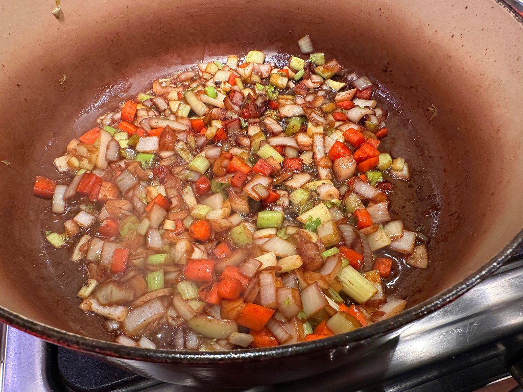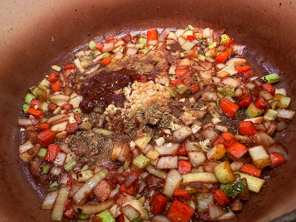 4. Pour all but 2 tablespoons of the fat from the pot. (If there is not enough, add oil to equal 2 tablespoons) Return the pot to medium heat, then add the onion, celery, and carrot. Season with a pinch of salt and pepper, and cook, stirring often and scraping the bottom of the pot with a wooden spatula, until the vegetables begin to soften, 5 to 6 minutes. Stir in the garlic, chipotles, cumin, and oregano and cook, stirring occasionally, until fragrant, 1 to 2 minutes.