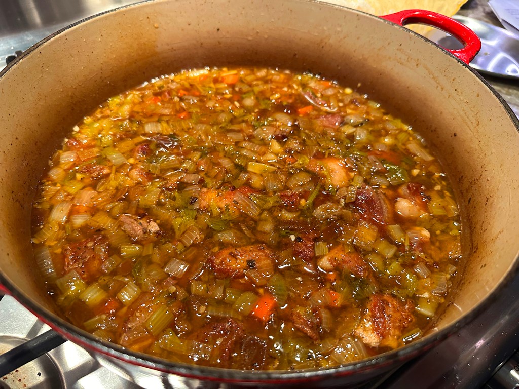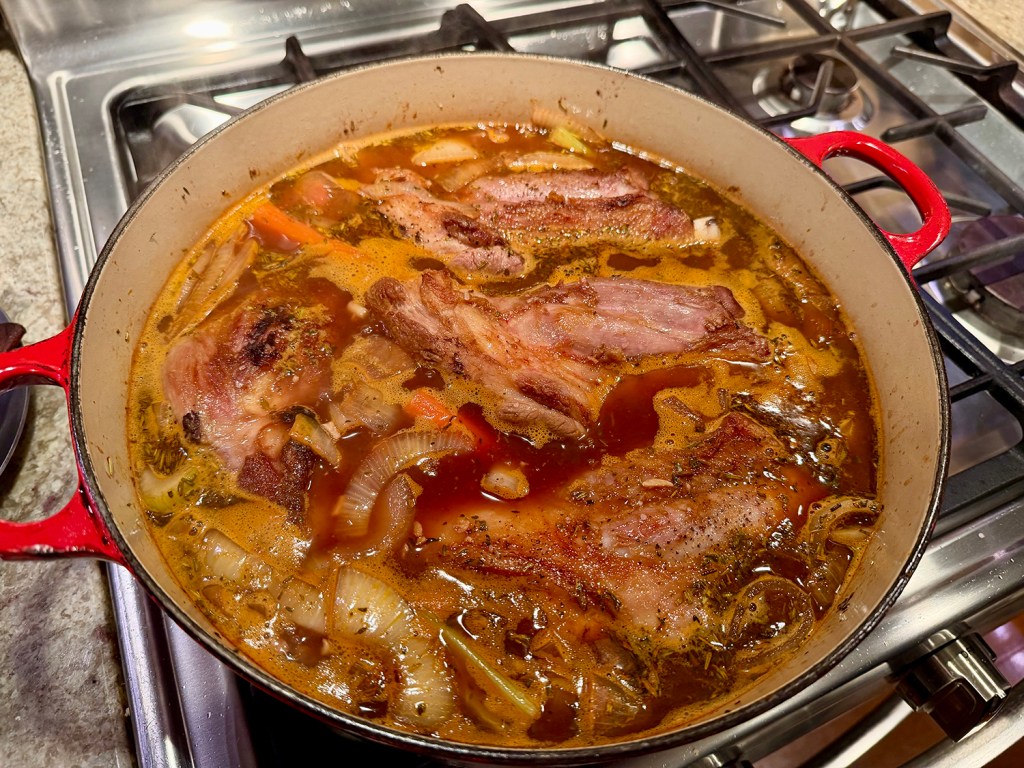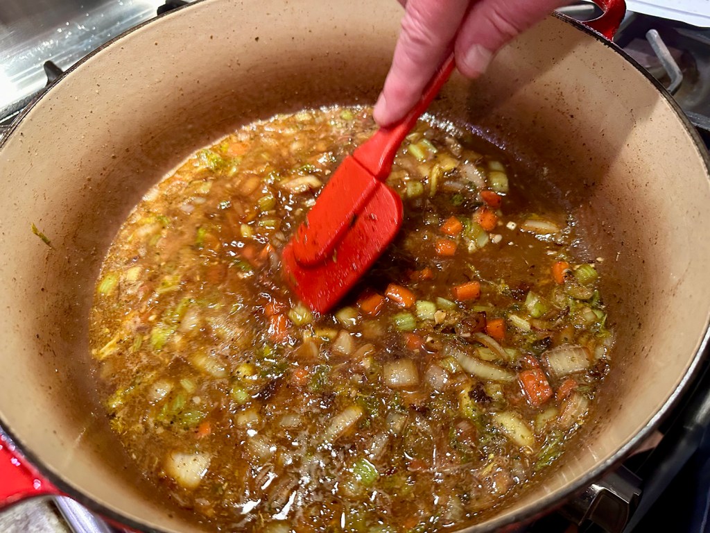 5. Add the beer, stirring with the wooden spatula to dissolve any browned bits on the bottom of the pot. Raise the heat to medium high and boil to reduce by about half, 5 to 8 minutes. Add the chicken broth and 1-1/2 cups water. Bring to a boil.