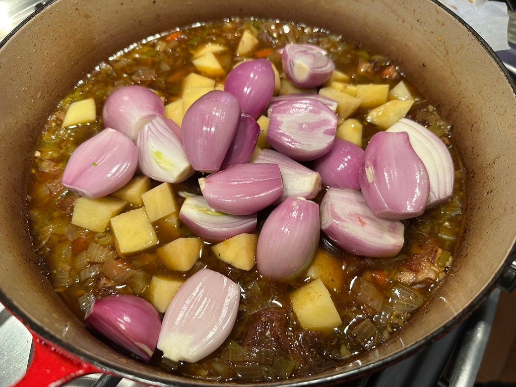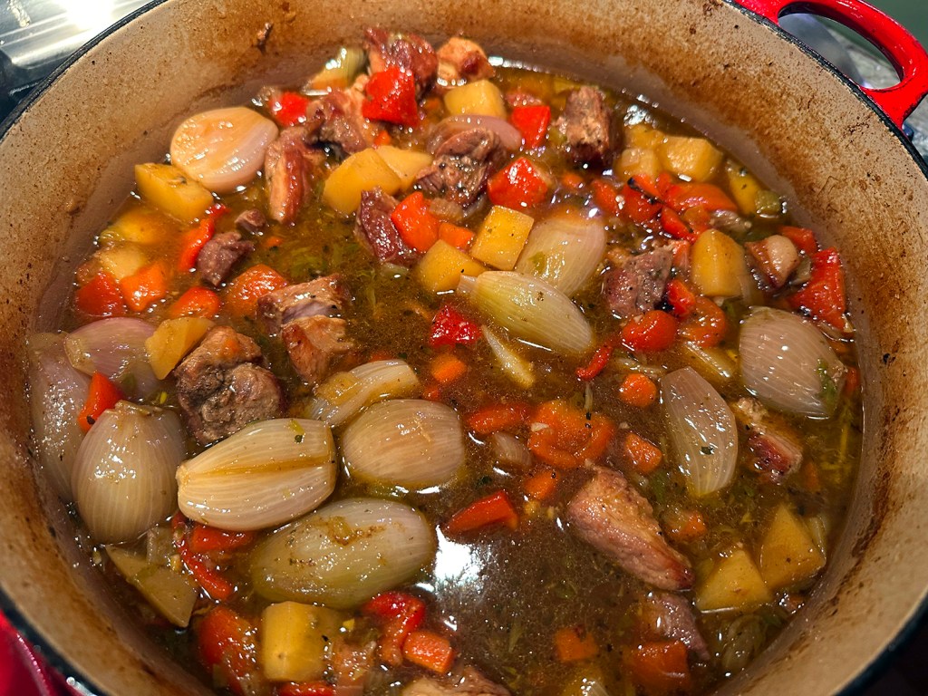 8. After 30 minutes of stewing, add the potatoes and shallots to the pot. Cover with the parchment and lid, return to the oven. After another 30 minutes, add the peppers. Cover with the parchment and lid, return the pot to the oven, and cook until the pork is fork-tender, 1/2 to 1 hour more.