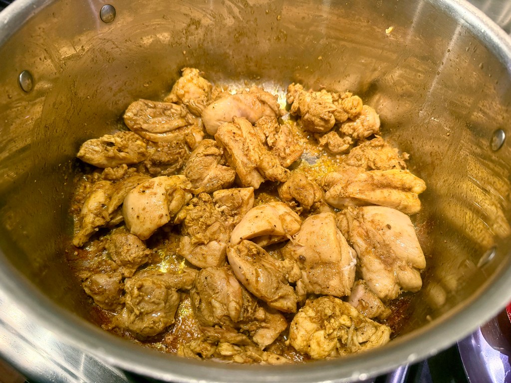 3. In a 6-quart Dutch oven or other heavy-duty pot, heat the oil over medium to medium-high heat until shimmering hot. Season about one-third of pork with salt and pepper and arrange it in a single layer in the pot (there should be at least 1/2 inch of space between the pieces). Brown well on at least 4 sides, adjusting the heat as necessary; each batch should take about 10 minutes to brown. Transfer the pork to a large bowl or rimmed baking sheet as it browns and repeat with the rest of the pork, seasoning with salt and pepper before browning. Once all of the pork is browned, remove the pot from the heat to let it cool for a few minutes.