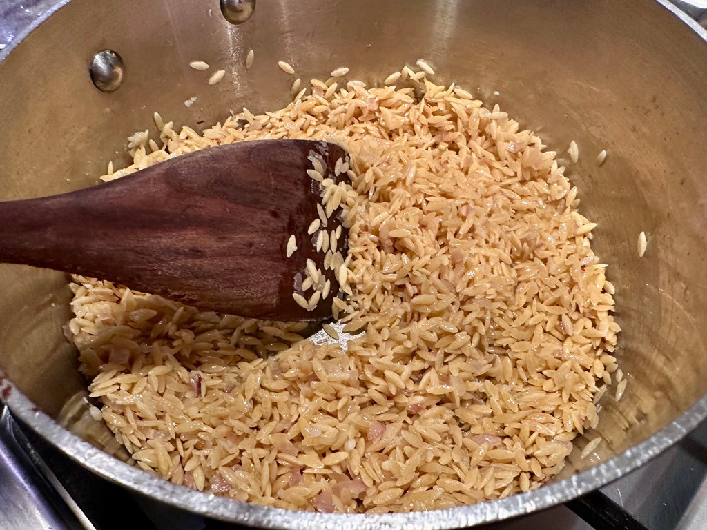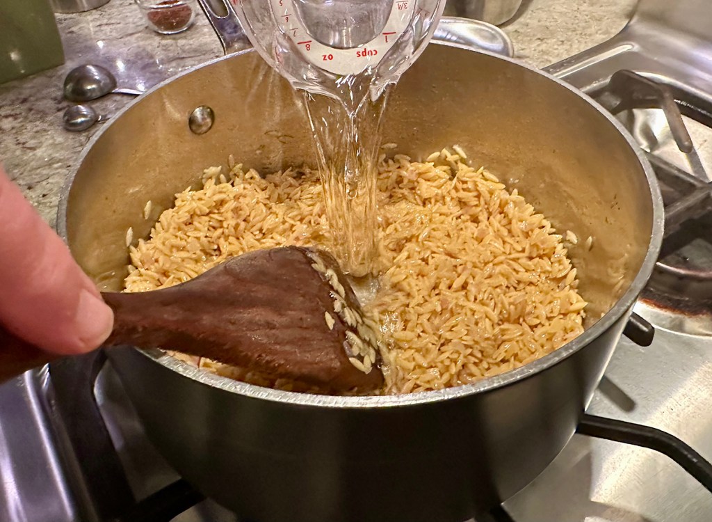 3. Stir in water (see head note) and 2 cups chicken broth. Increase heat and bring to boil; reduce heat to maintain vigorous simmer and cook, stirring occasionally, until liquid is reduced and thickened, and orzo is al dente, about 15 minutes (if orzo starts to stick toward end of cooking time, reduce heat and stir more frequently). Stir in lemon zest. Season with salt to taste.