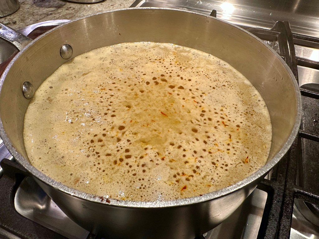2. Add water, garlic, and peppercorns to the large saucepan with the shells. Zest lemon and set the zest aside. Halve lemon and squeeze juice into the water mixture, then add the lemon halves to the saucepan. Bring to just a boil over high, then reduce the heat to maintain a simmer. Cook, uncovered and undisturbed, to infuse liquid, about 10 minutes. Remove and discard only the shells.
