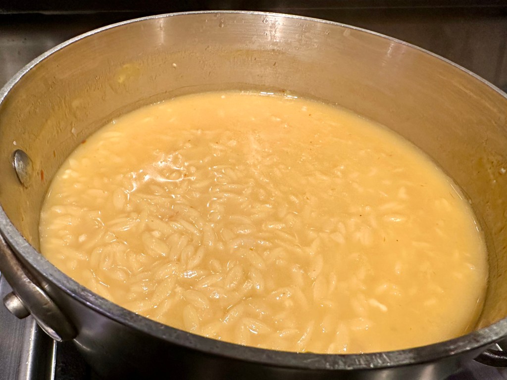 2. Add 1 teaspoon minced garlic and ¼ teaspoon saffron threads, crumbled, and cook until fragrant, about 30 seconds. Add 1½ cups orzo and stir until evenly coated. Add ½ cup white wine and cook, stirring constantly, until fully absorbed, about 30 seconds.