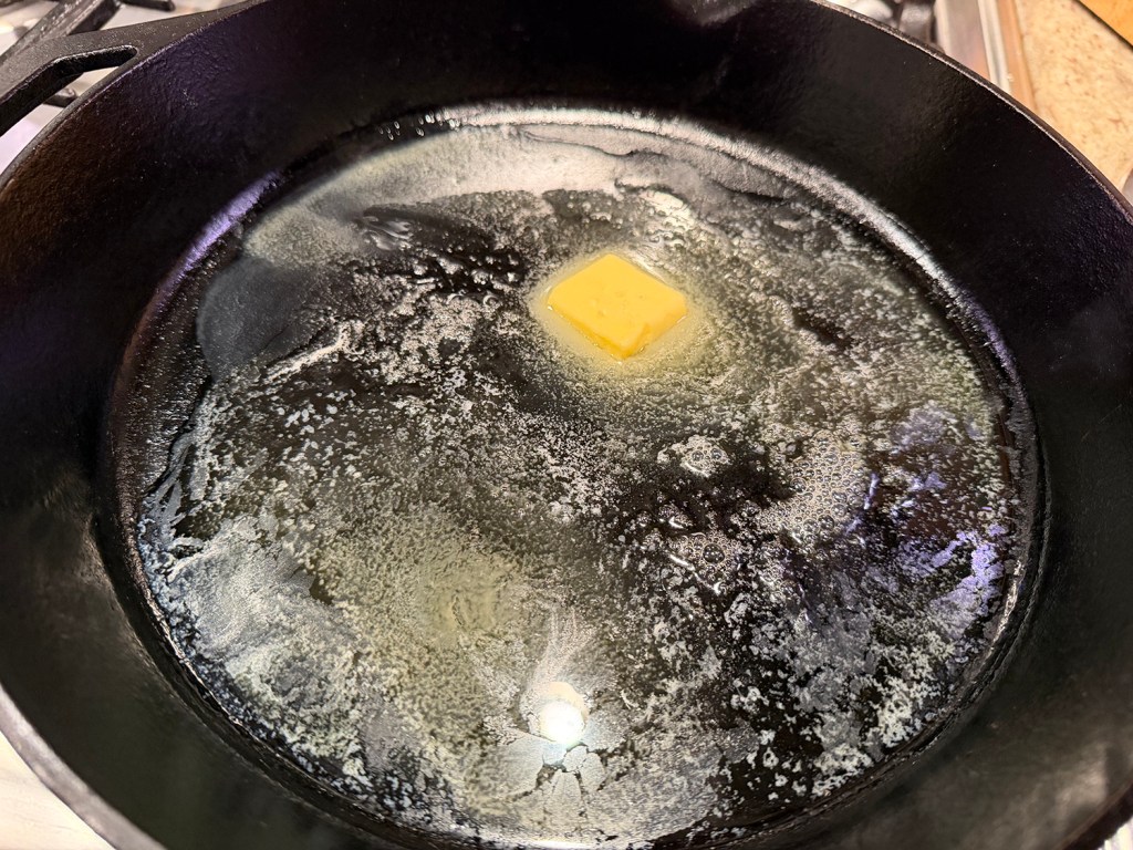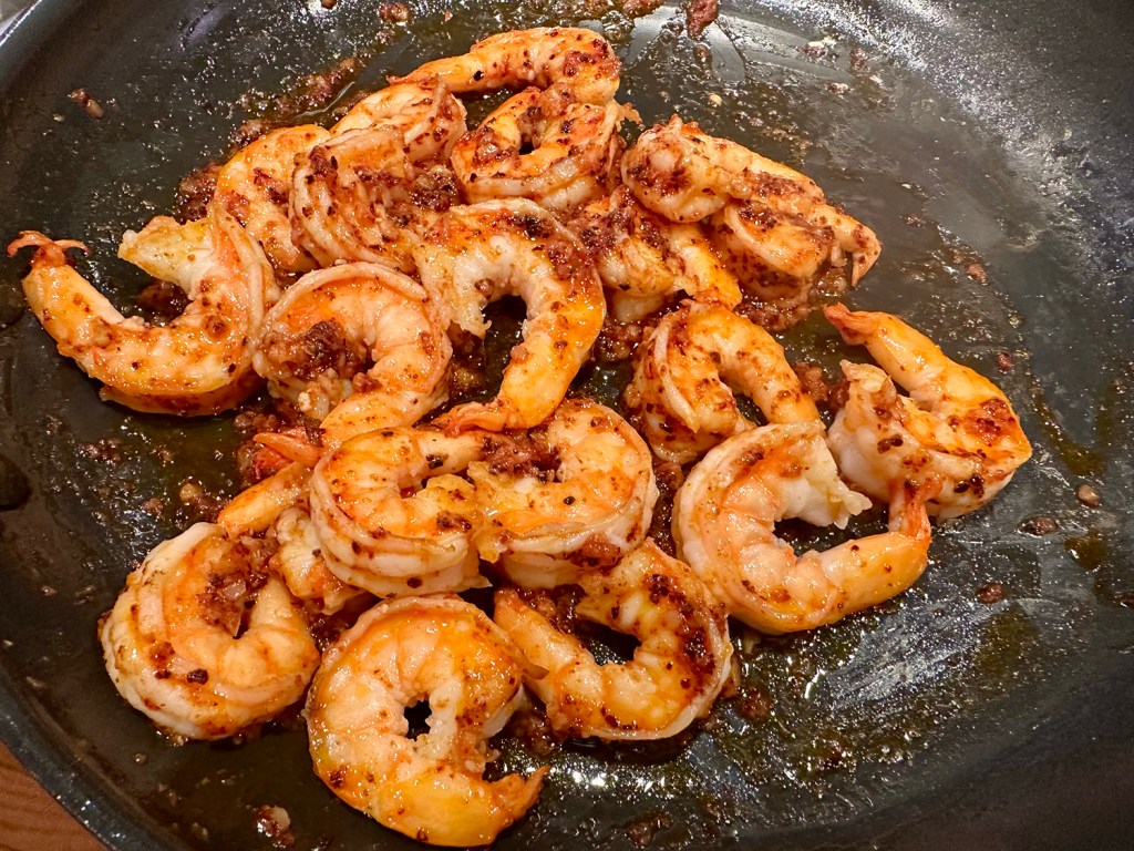 5. Pat 1 pound shrimp, peeled, deveined, and tails removed, dry with paper towels. Combine shrimp, 1 teaspoon vegetable oil, and remaining ¼ teaspoon salt in now-empy skillet and toss to coat. Spread into even layer. Cook over high heat until edges turn pink, 3 to 4 minutes. Remove skillet from heat. Working quickly, use tongs to flip each shrimp. Let stand until second side is opaque, about 2 minutes. Add butter mixture to skillet and stir until shrimp is coated.