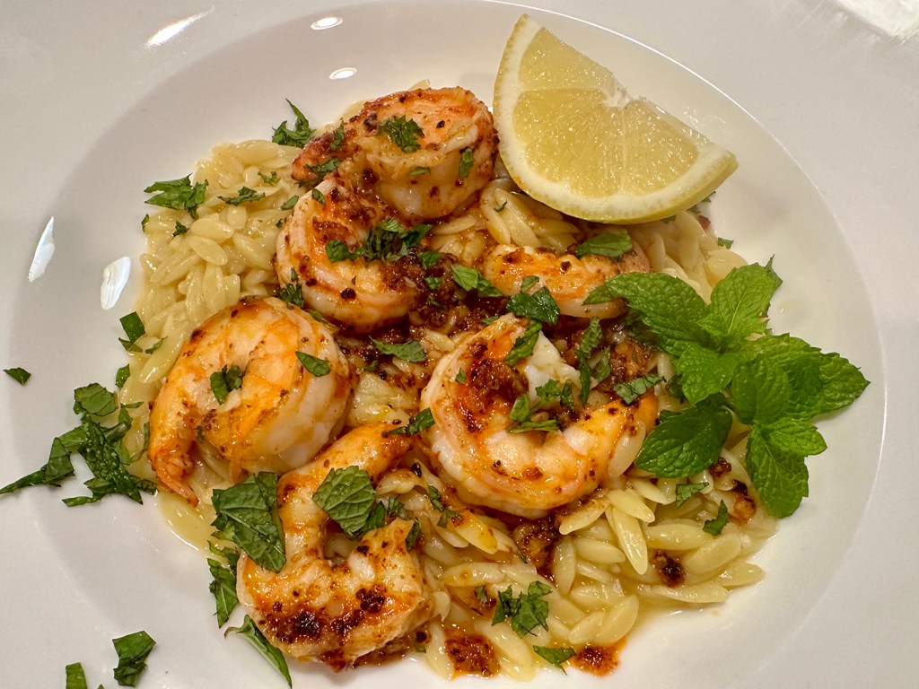 6. Transfer orzo to wide serving bowl. Top with shrimp; sprinkle with 3 tablespoons chopped mint; and serve, passing lemon wedges separately.