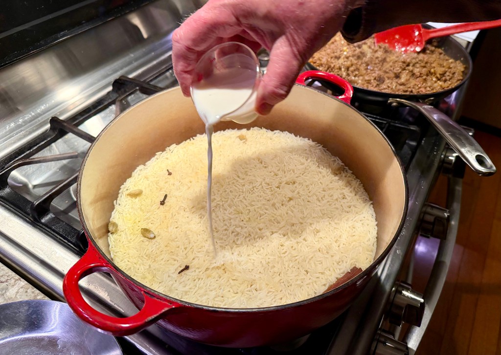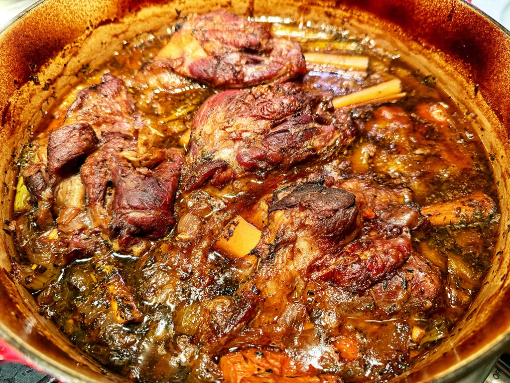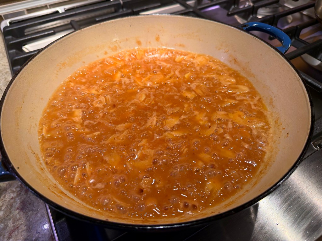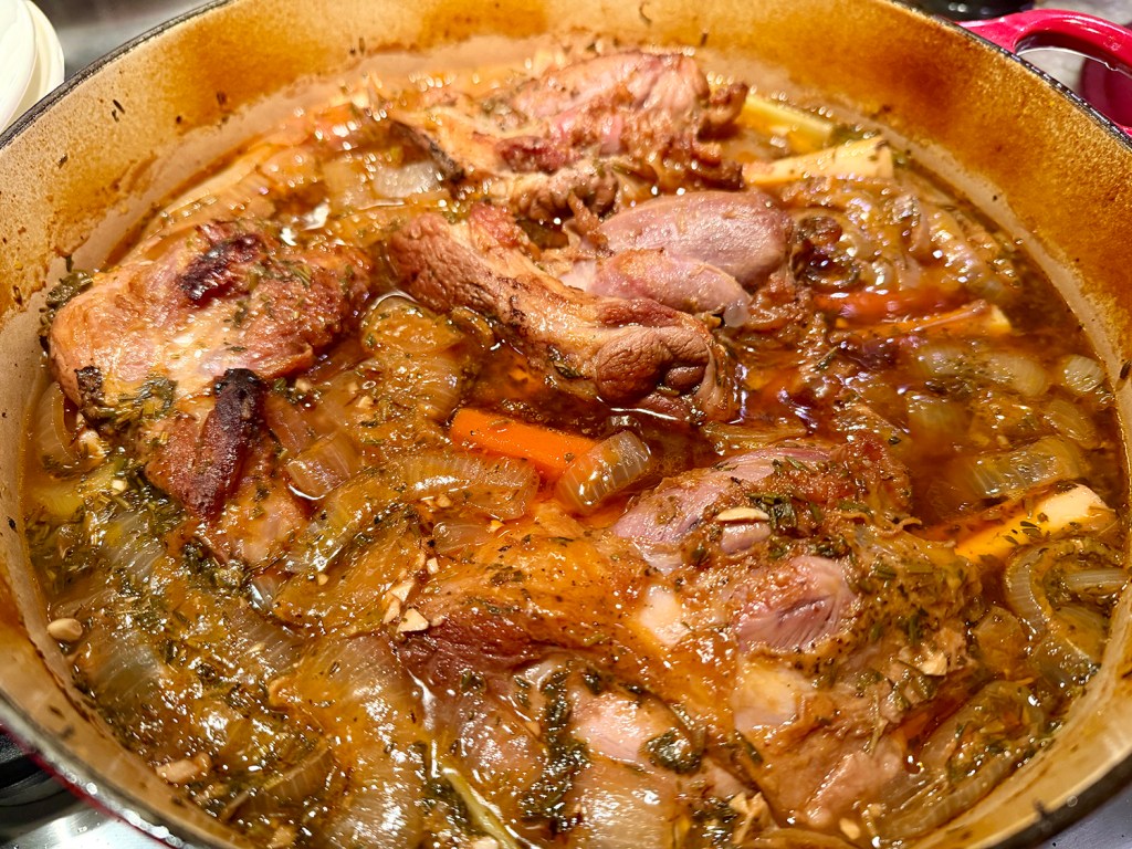 6. Return the pork to the pot along with any accumulated juice. Lower the heat to maintain a simmer.