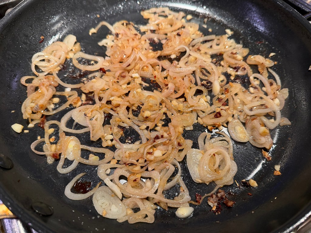 3. Pour off all but 4 tsp. oil from pan; discard. Return pan to medium heat and cook 3 medium shallots, thinly sliced, stirring often, until just tender, about 4 minutes. Add 12 garlic cloves, thinly sliced, and cook, stirring often, until fragrant, about 3 minutes. Sprinkle in 1 Tbsp. all-purpose flour and stir to coat, then remove from heat (make sure pan is far away from the burner).