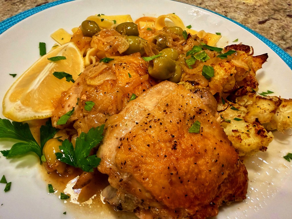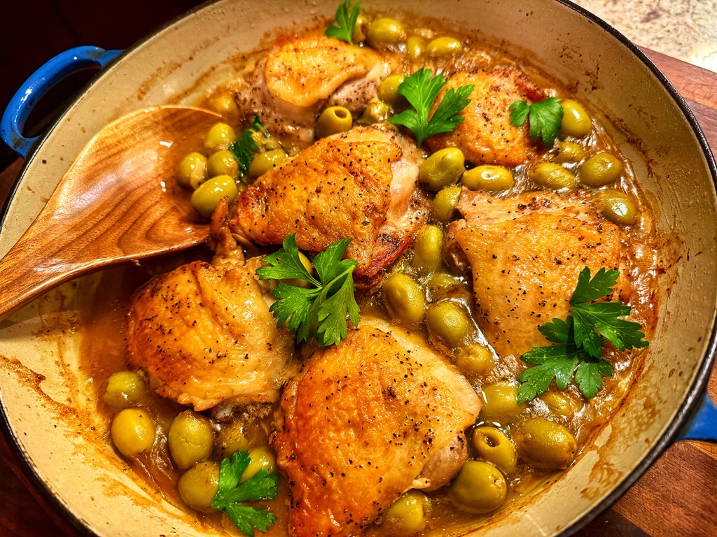 OK, now let’s get real. The amount of chicken is considered measly in our minds. Two pounds of bone-in chicken thighs is just not enough to feed 4 adults. Plan on 6 to 8 decent-sized thighs, no matter what the weight ends up being. Regarding the olives, our jar was 6.25 ounces*, and gave us exactly 2/3 brine.