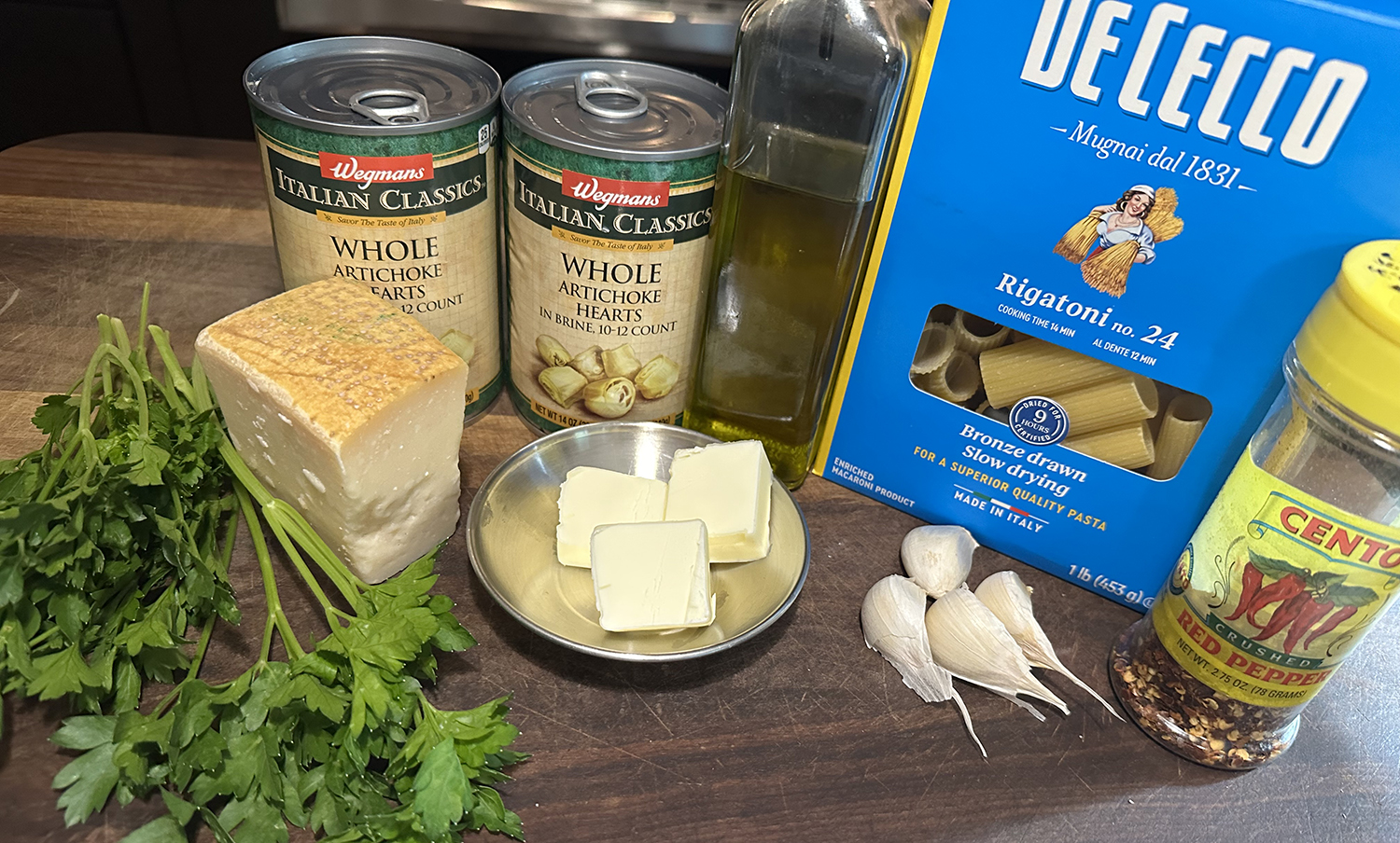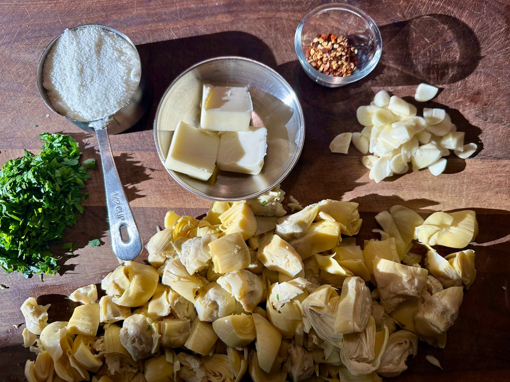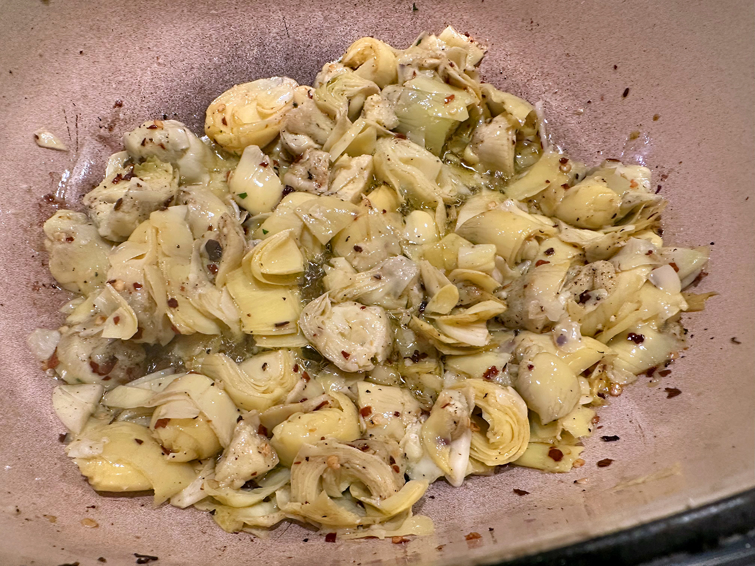 - 1 12-oz. jar marinated artichoke hearts, drained (about 1 heaping cup artichoke hearts)