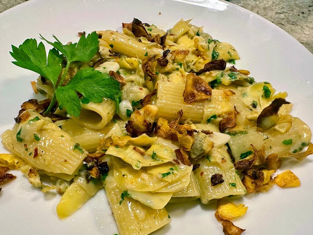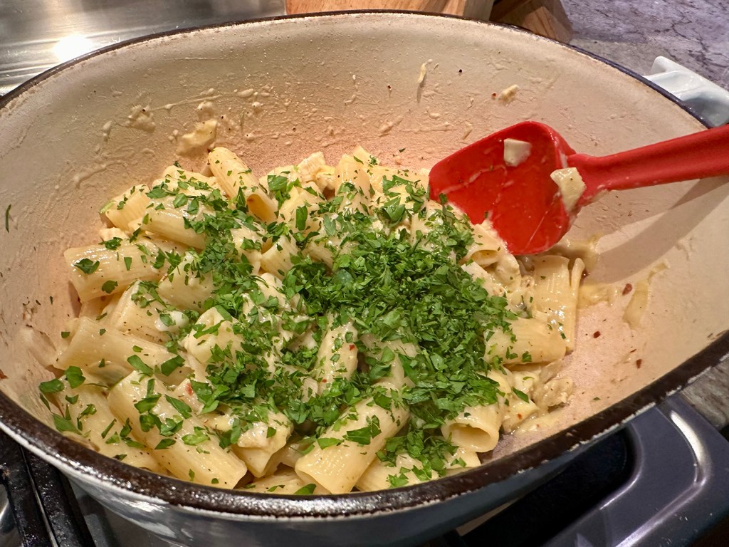 Some changes we made included adding olive oil with the butter and browning the chicken thighs on both sides to render some of the fat and add that extra layer of flavorful fond for the base. A parm rind was incorporated at the time the wine and stock are added to the pot. The original amount of 1/2 cup of fresh dill just seemed overpowering, so we cut by half, to a quarter cup, plus more for garnish.